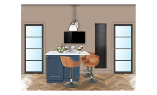 Two adjustable bar stools in rich whisky-colored leather sit adjacent to the countertop, creating a casual dining area. A dark pendant light fixture hangs above, offering a modern touch.