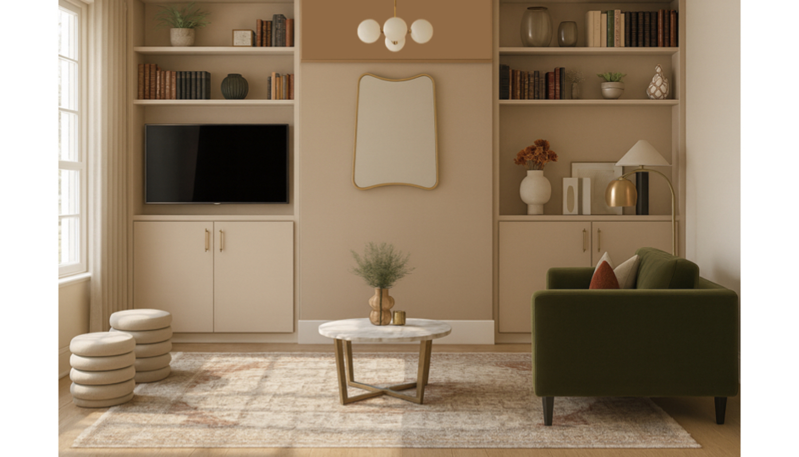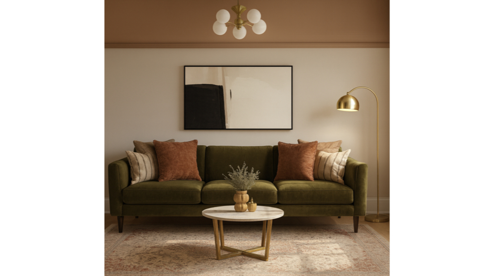 This inviting living room and home office blend features a rich, meadow green sofa adorned with rust and cream cushions, creating a warm and cozy focal point. A stylish white round coffee table sits in front, held by a sleek gold metal base, enhancing the elegant aesthetic of the space.