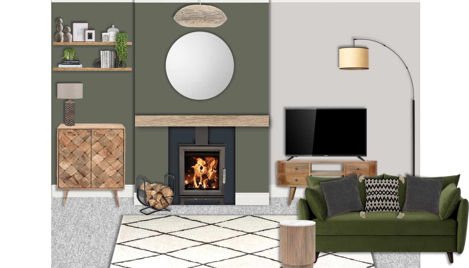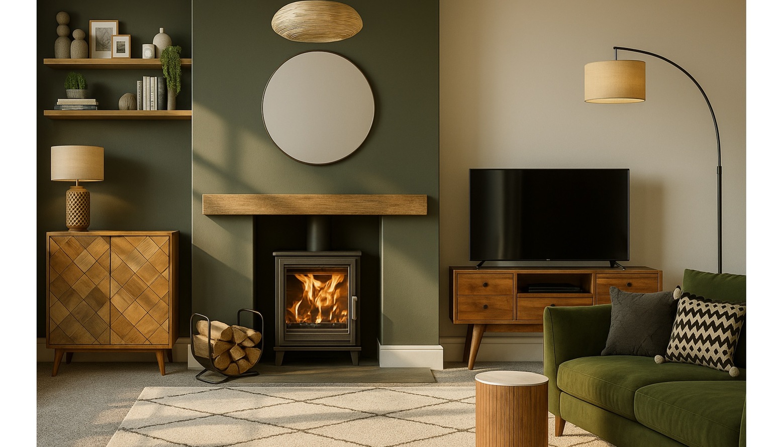 This living room design features a rich, earthy color palette dominated by deep green walls, creating a cozy and inviting atmosphere. A prominent rounded entertainment unit serves as a stylish focal point, paired with a sleek, modern TV set on an elegant wooden console with multiple drawers for storage.
