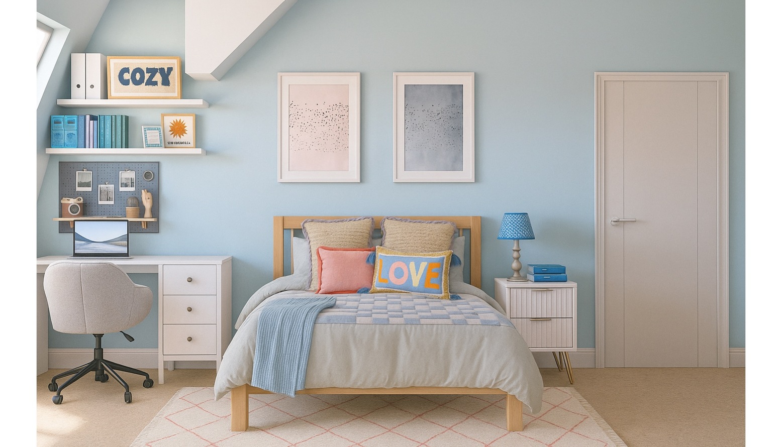This inviting bedroom features a serene lilac theme complemented by soft pastel shades and functional furniture. A cozy double bed takes center stage, adorned with a variety of cushions in shades of pink and blue, along with a charming checkered quilt. Above the bed, two elegant framed artworks add a touch of sophistication to the room.