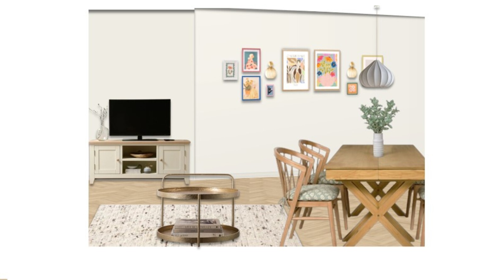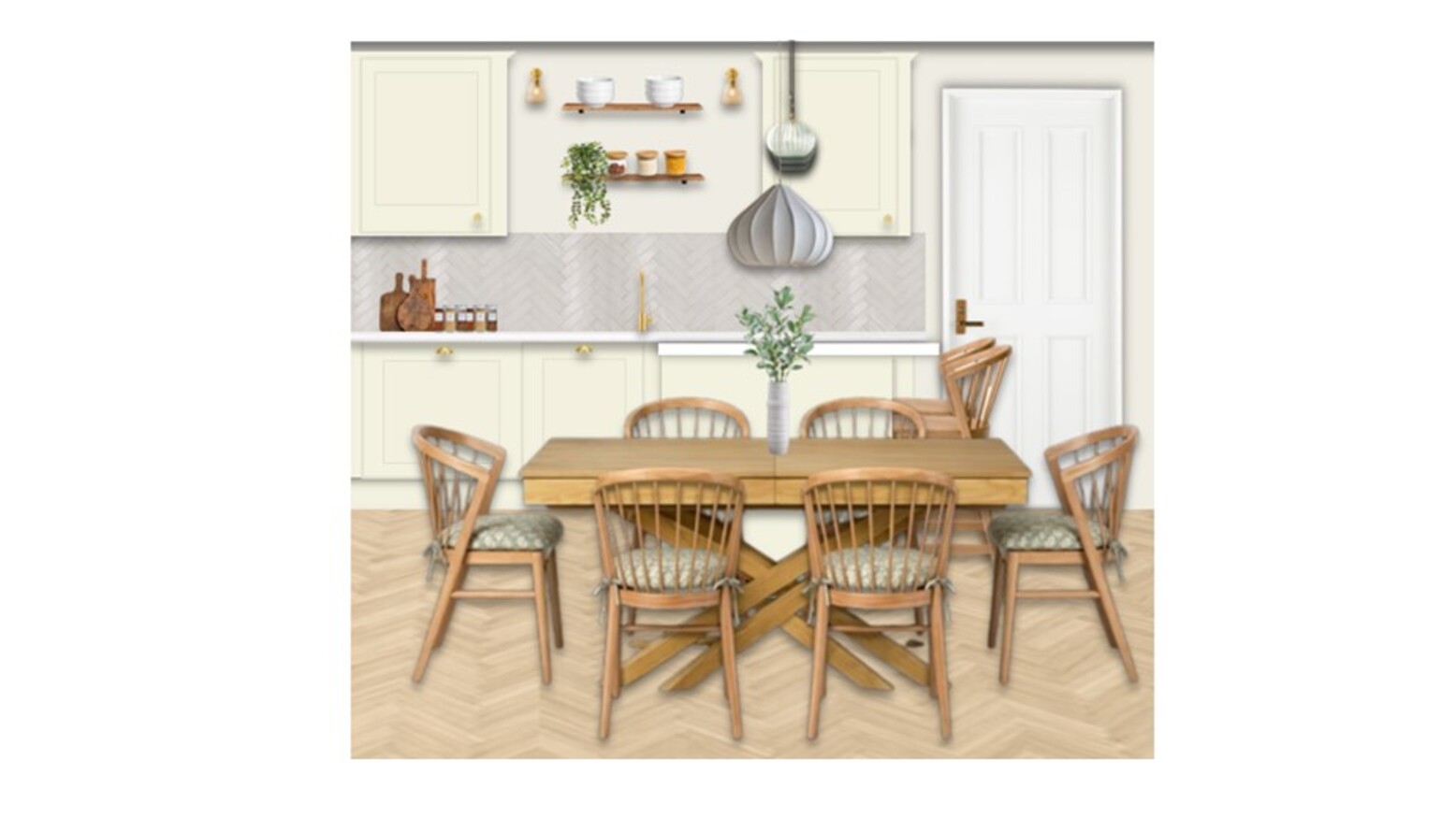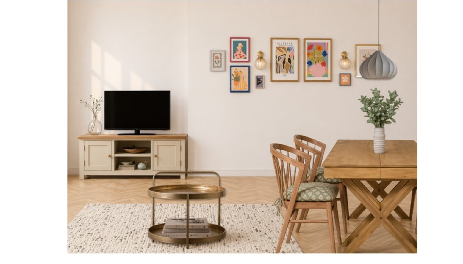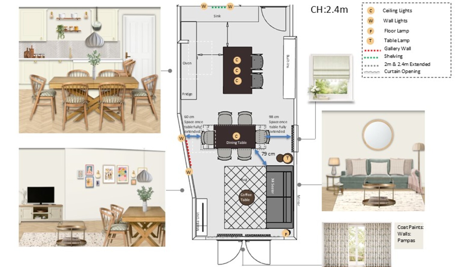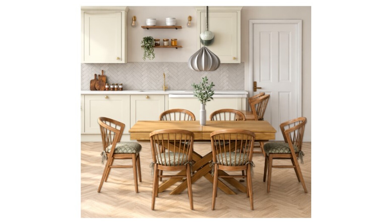 The triple-function room elegantly combines living, dining, and kitchen areas into a cohesive design. The vibrant Isla 4 Seat Sofa in Sage Smart Velvet adds a refreshing touch, inviting comfort and style. Complementing it, the Amelia Oak Extendable Dining Table Set features Mabel Oak Spindle Back Chairs, ideal for hosting larger gatherings. A Highstead Coffee Table in gold finish introduces a chic focal point within the space. Underfoot, a John Lewis Brook Chunky Hand Woven Wool Rich Rug in natural tones harmonizes with the overall palette.