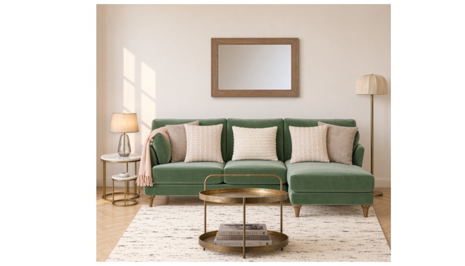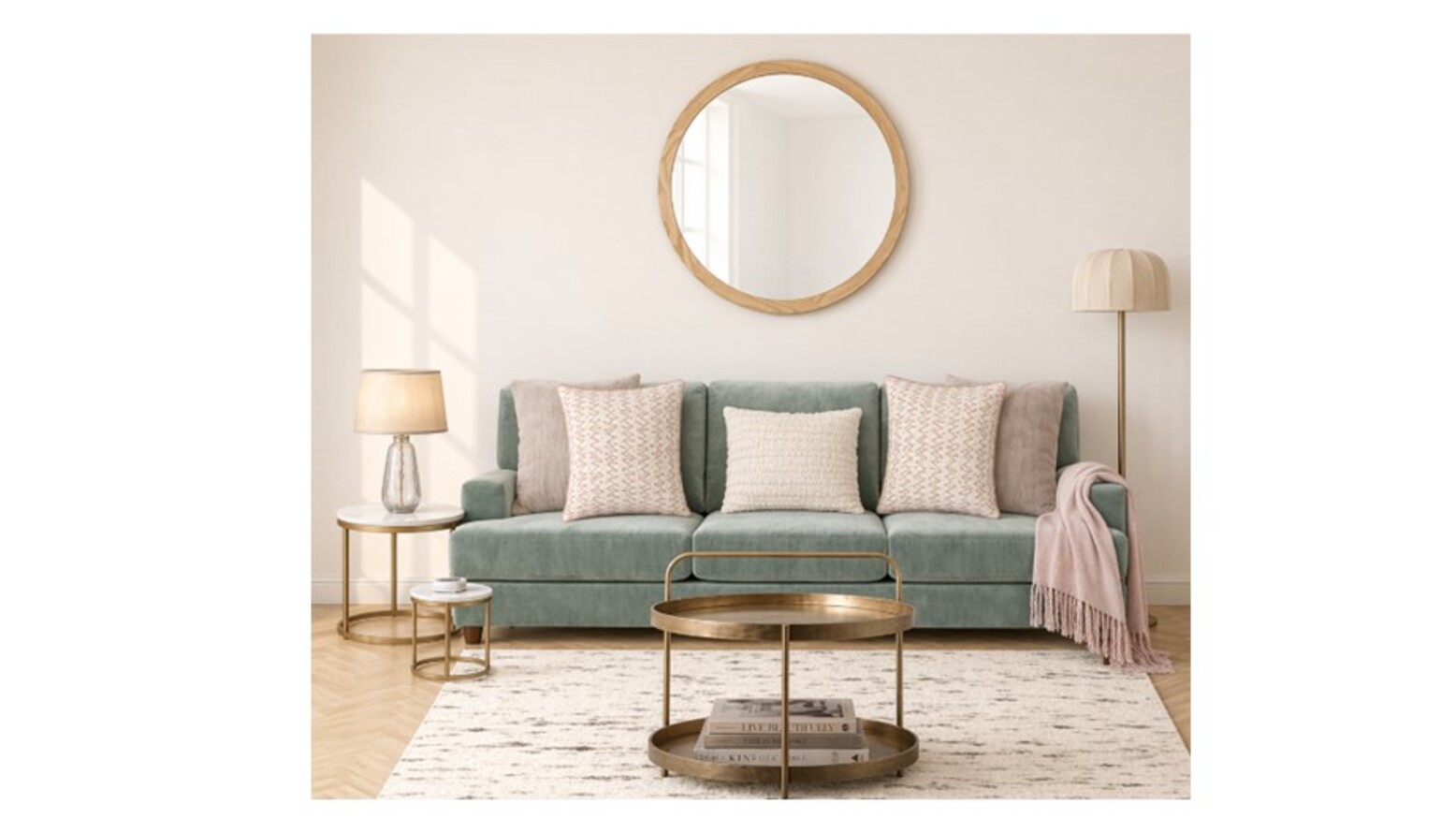 Lighting is thoughtfully curated with a Classic pendant light kit in antiqued brass, complemented by an Ottino aged brass and linen floor lamp. The room benefits from natural light, further enhanced by the John Lewis Slim Solid Oak Wood Round Wall Mirror, creating an illusion of spaciousness.