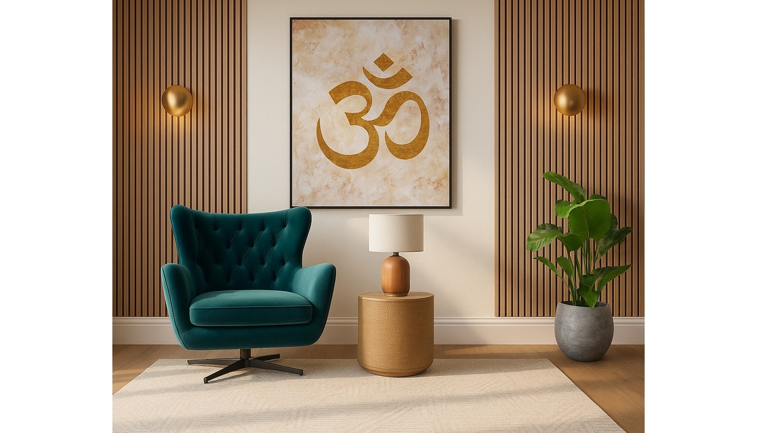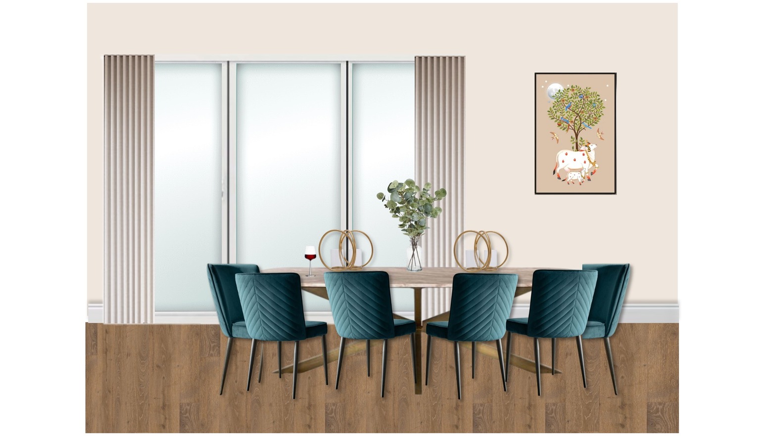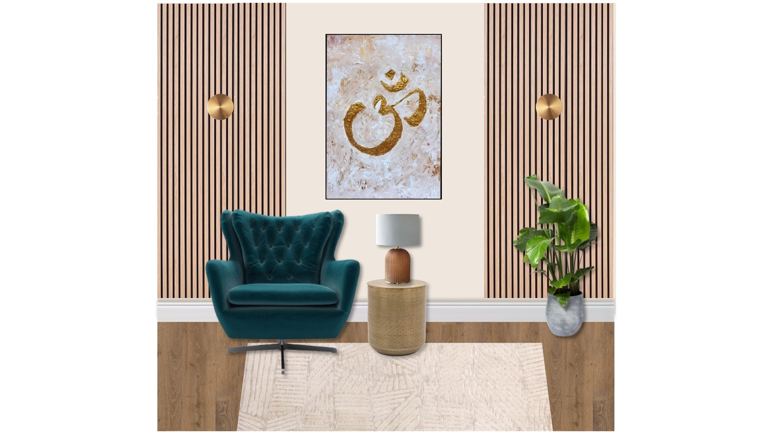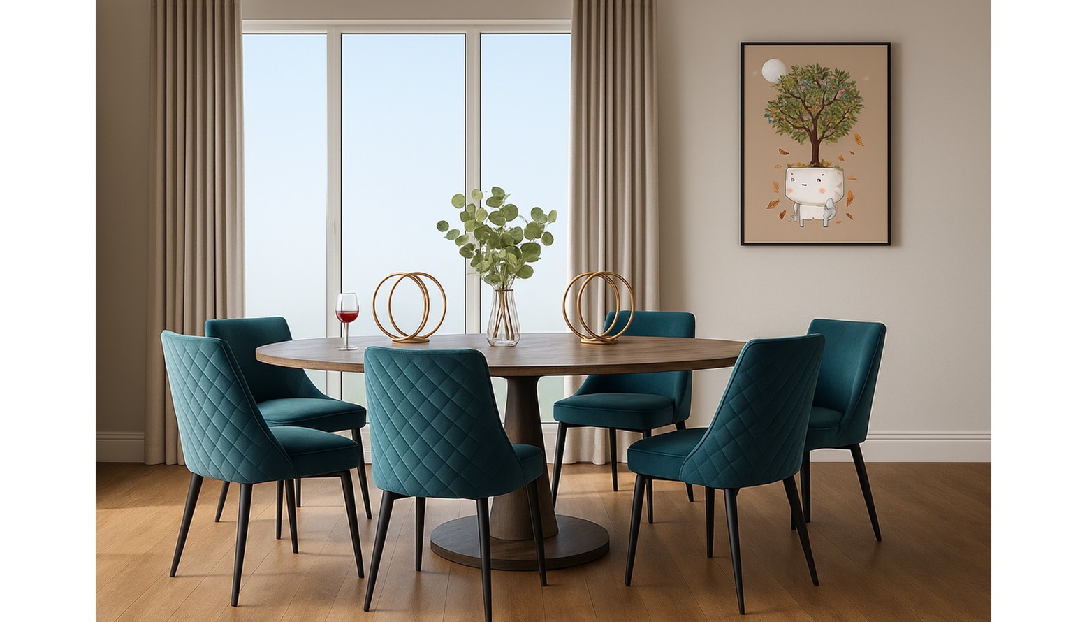 The multipurpose living, dining, and kitchen space features a sophisticated colour palette rooted in deep turquoise and nature-inspired greens. A striking Ernest Swivel Armchair upholstered in deep turquoise cotton matt velvet offers a plush seating option, creating a focal point in the room. The Richmond Interiors Dining Table showcases a Danish oval design in a fresh white finish, providing an inviting area for dining and gatherings. Surrounding it, the Serena Modern Velvet Dining Chairs, with dark teal upholstery and chevron stitch detailing, enhance comfort and style. For casual seating, the Ethan Caramel Fabric Bar Stool, with brushed bronze footrests and tapered legs, complements the aesthetic while providing functionality. A chic Crescent Coffee Table serves as a stylish centerpiece, while the Nasya Side Table adds both utility and charm. A generously sized Porcelain Cream Textured Rug grounds the space with its high/low pile texture, inviting warmth underfoot. Lighting plays a crucial role, highlighted by the Amalfi Ridged Frosted Glass Table Lamp, which features brushed brass accents and offers a soft glow. Additionally, the larger Helios rechargeable wall light in brushed gold aluminium brings modern illumination to the walls. Greenery is introduced through the John Lewis Artificial Eucalyptus in a glass vase, and the eye-catching Little Botanical Extra Large Lemon Dracaena plant, both of which breathe life into the design. Accessories like the Melange Acrylic Throw in rust add texture and colour, enhancing the overall comfort of the room. The carefully selected artwork, showcasing a warm golden hue, effortlessly pulls the scheme together, while the juxtaposition of materials enriches the visual interest of the space.