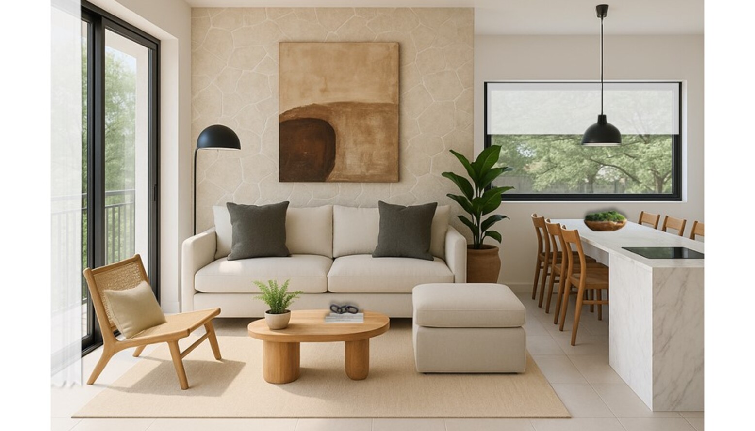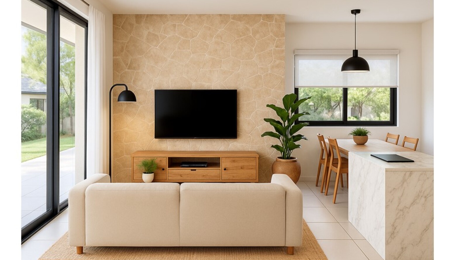 A soft beige color palette sets a warm and inviting tone throughout the room. A textured stone wall serves as a backdrop, enhancing the cozy atmosphere.