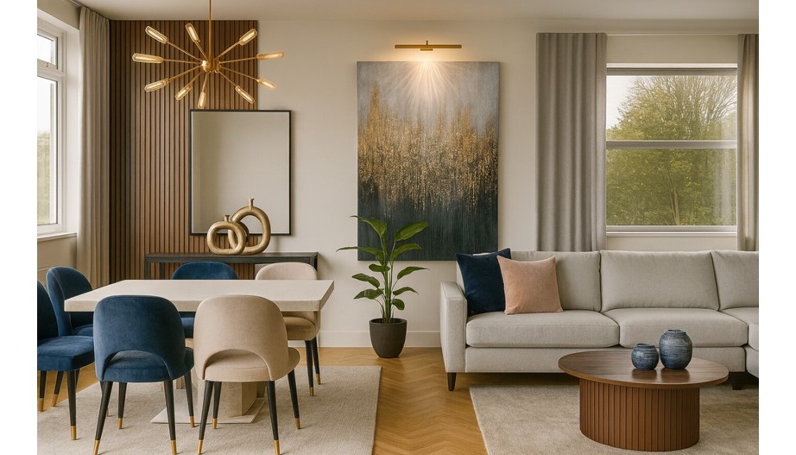 A striking artwork, framed elegantly, captivates attention on the wall, while a leaner mirror reflects light and enhances the spaciousness of the room. Warm brass lighting fixtures and strategically placed floor lights provide softness, illuminating the room without being overpowering.