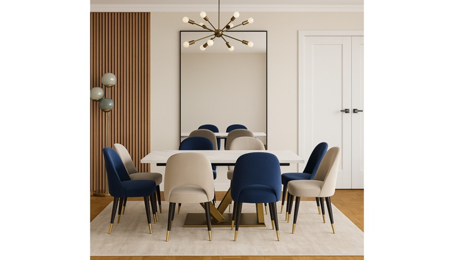 To the side, the dining space boasts a contemporary white ceramic 8-seater dining table, surrounded by a set of two champagne velvet dining chairs and an additional set of two bar stools in dark grey. These upholstery choices introduce textural interest while maintaining a cohesive look.