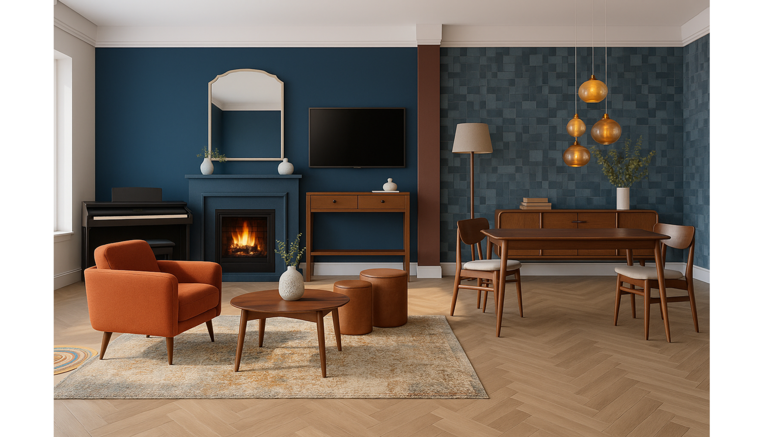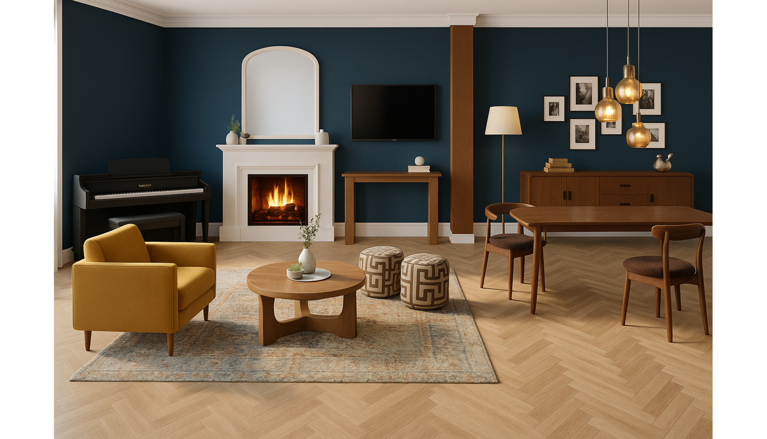 A rich navy backdrop forms the walls, providing a striking contrast to the warm wooden floors that feature a herringbone pattern. Central to the living space is a cozy, mustard-colored Izzy 3 Seat Sofa Bed, paired with a modern shape cushion cover in a deep petrol hue.