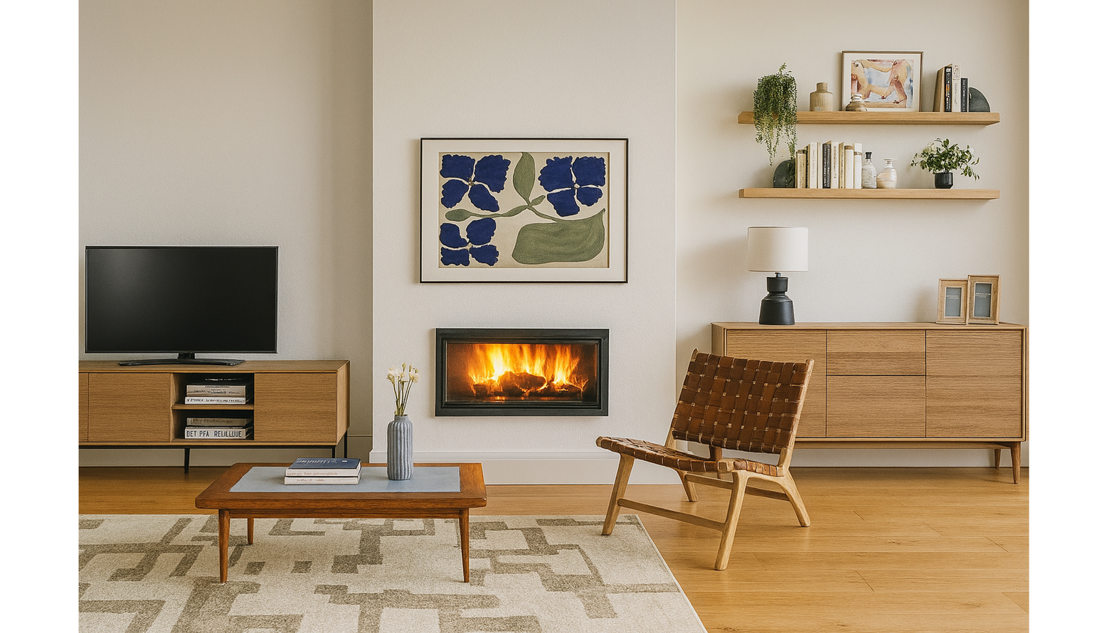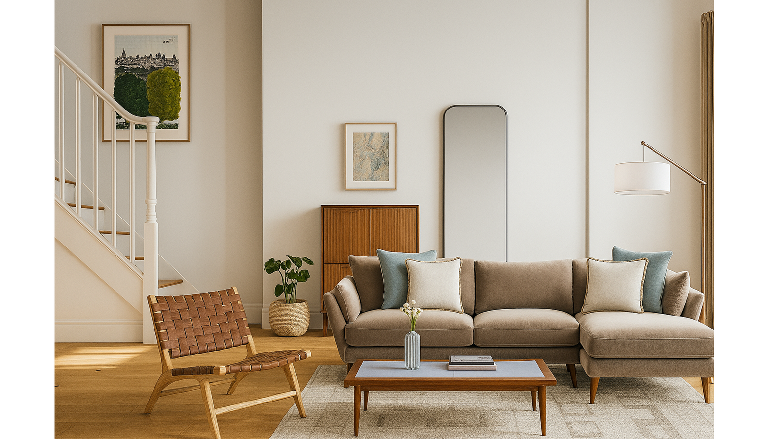 This multifunctional living, dining, and kitchen space boasts a harmonious blend of functionality and style. A rich green velvet sofa invites relaxation and is adorned with off-white and rust-colored cushions, offering comfort and visual interest. The centerpiece is a Lenon extendable dining table crafted from natural FSC Mix Credit solid oak wood, elegantly set with a ceramic vase and a selection of flowers. To one side, a brown Calixta armchair complements the area's warmth and provides additional seating. Nearby, a stylish sideboard in oak wood and veneer adds practical storage while enhancing the room’s aesthetic. Natural light bathes the space, thanks to strategically placed mirrors and a well-chosen light fixture that accentuates the ambiance. Complementing the decor are wall-mounted shelves and artwork that lend a personal touch, all while plants—both real and faux—infuse life into the environment. A carefully selected rug grounds the area, delineating the living space from the dining section, and stylish bar stools invite casual gatherings around the table. The overall color palette harmonizes with the natural materials, creating a cohesive and inviting atmosphere perfect for daily living and entertaining.