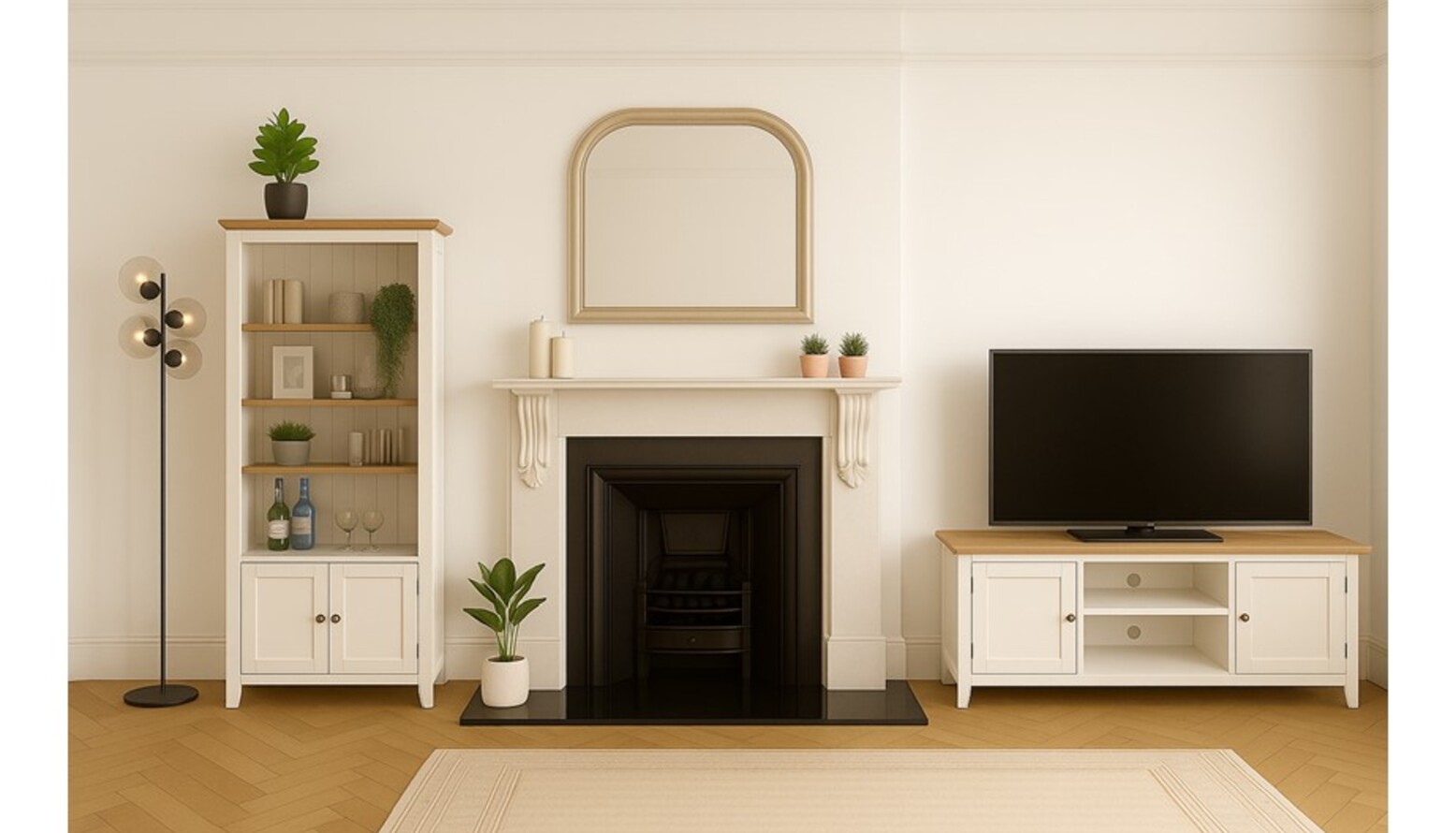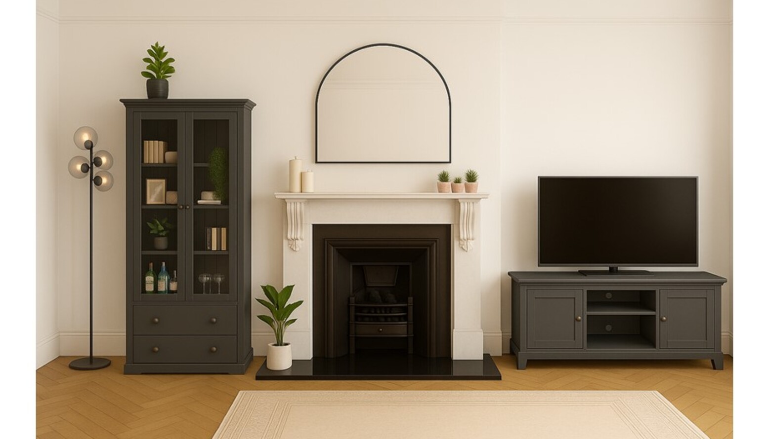 A stylish fireplace serves as a focal point, framed by a sleek black mantel that contrasts elegantly with the soft cream walls. Above the mantel, a rounded mirror reflects light and adds depth, while shelves on either side provide practical storage and display space.