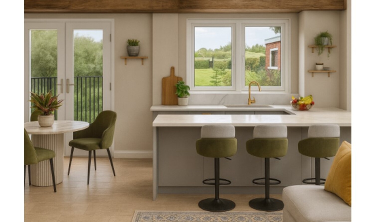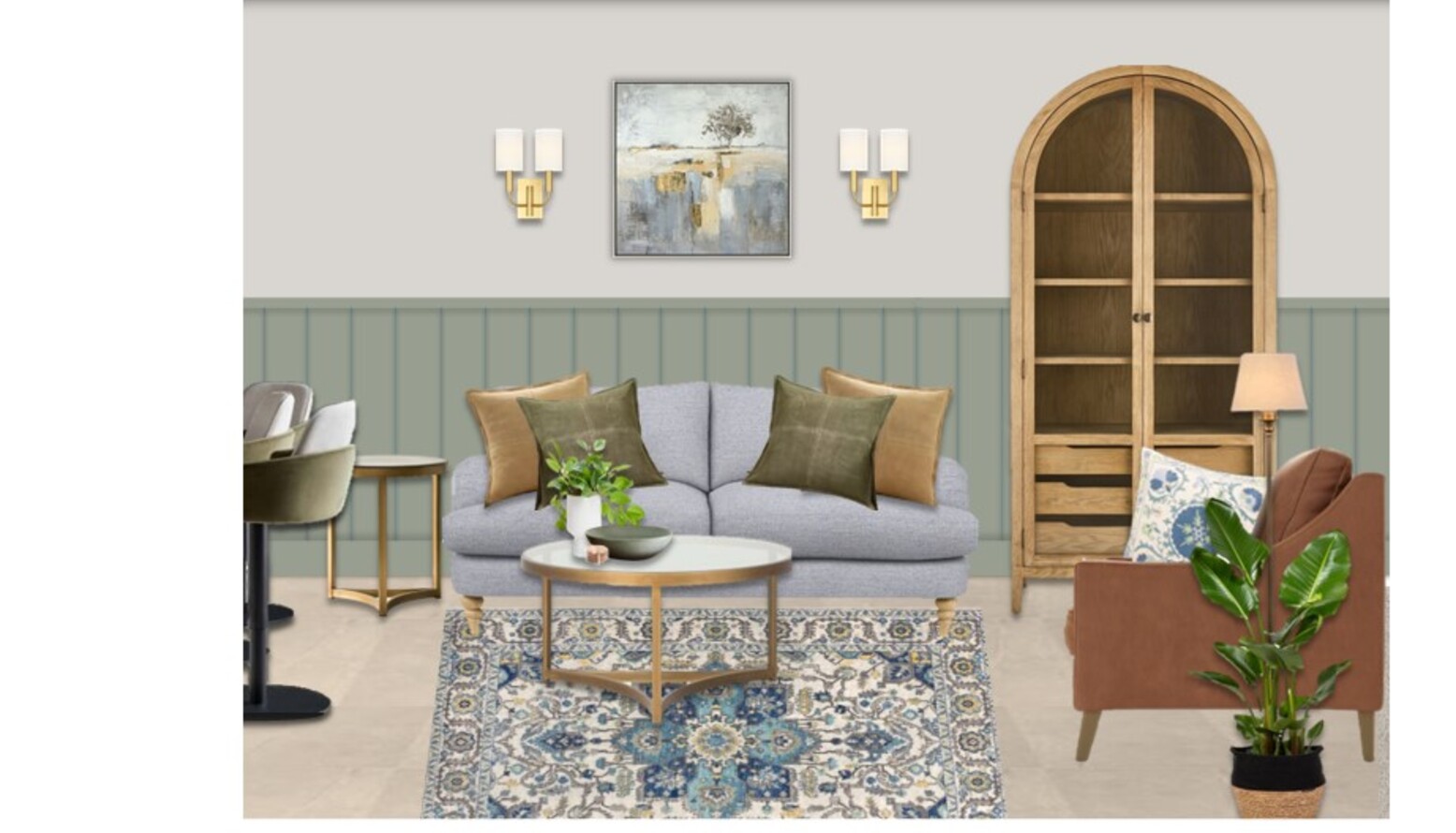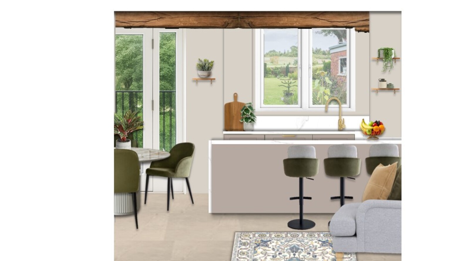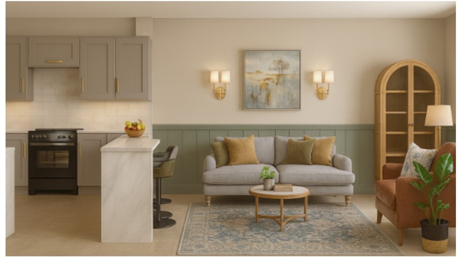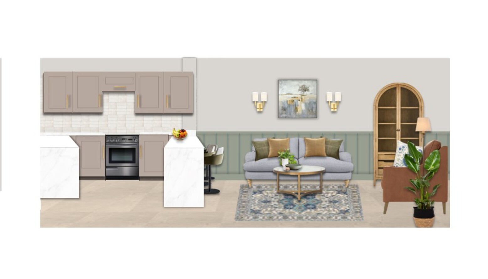 This triple-function living/dining/kitchen room seamlessly blends three essential spaces into one harmonious environment. The room boasts a cozy sofa arrangement, featuring an Iggy 2 Seat Sofa in Cognac Grain Leather and a John Lewis Otley Large 3 Seater Sofa, adorned with plush cushions in a palette of muted blues and earthy tones. A standout feature is the washable rug in a mix of blue and multicolor hues, anchoring the seating area and adding warmth. A natural wood coffee table and a curved cabinet provide storage and display options without overwhelming the space. Adjacent to this, the kitchen showcases sleek, modern cabinetry in soft gray, accentuated by gold hardware. Marble counters seamlessly connect the dining and cooking areas, complemented by stylish bar stools that add an inviting touch for casual meals. In terms of lighting, wall sconces flank a beautiful art piece reflecting tranquil outdoor scenes, while a floor lamp provides additional illumination, enveloping the room in a soft glow. The carefully curated selection of faux and real plants adds a refreshing natural element, enhancing the inviting ambiance. The overall color scheme combines gentle greens, soothing blues, and warm wood tones, creating an inviting, modern living space perfect for relaxation and entertaining.
