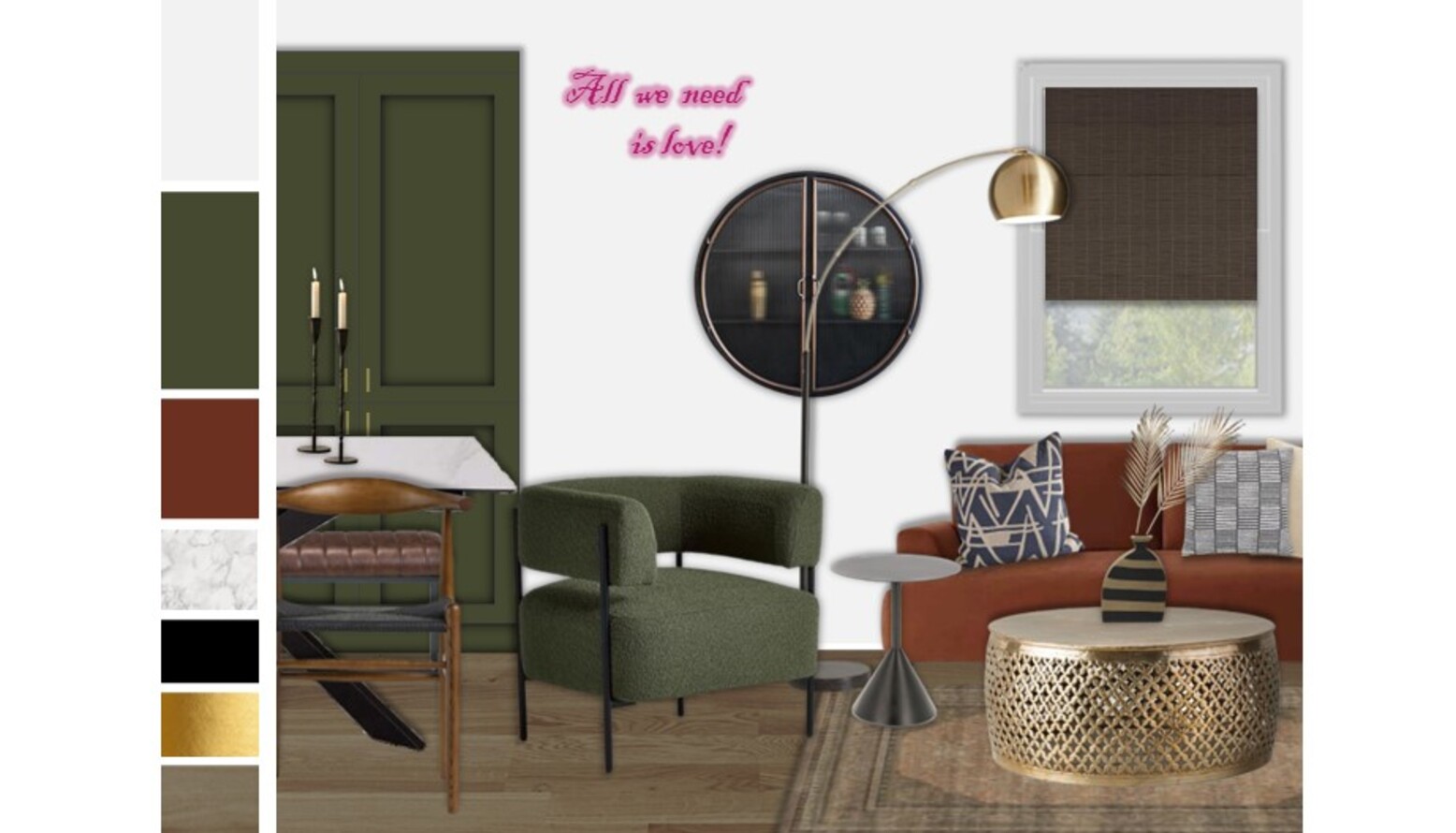 This triple-function room seamlessly blends living, kitchen, and dining spaces for a harmonious design. The focal point is an inviting umber sofa, complemented by a green boucle armchair, both offering comfort and style. A round coffee table with intricate gold detailing adds a touch of elegance, while a textured woven rug in muted hues grounds the space. Natural light filters through a window adorned with simple yet chic window shades, enhancing the room's bright ambiance. Accent pieces like a striking LED neon light proclaiming 'All we need is love!' add personality and warmth. The dining area features a white marbled ceramic dining table that can extend to accommodate guests, paired with striking black dining chairs that provide contrast and sophistication. A sleek sideboard offers storage solutions while enhancing the overall décor with its modern matte finish. Decorative elements, such as a wall-mounted glass cabinet and a variety of faux plants, add life and texture to the room. The chosen artwork, echoing the color palette, brings a personal touch, ensuring the space reflects the homeowners' tastes. Overall, this room is a perfect blend of function and aesthetics, creating an inviting atmosphere for both living and entertaining.
