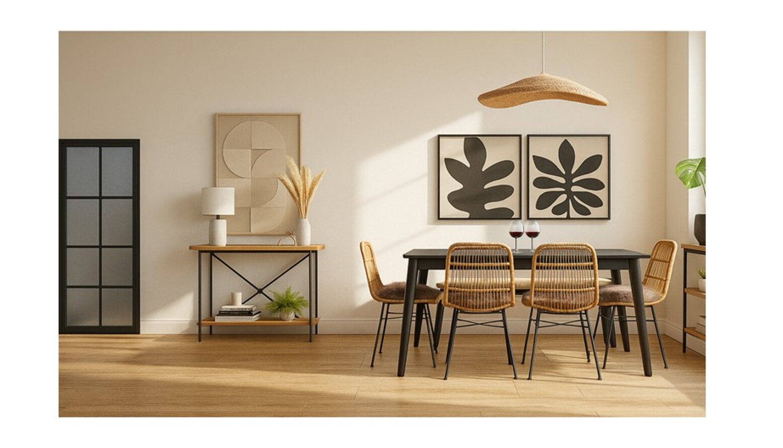 A harmonious triple-function space combining living, kitchen, and dining elements, this room exudes a warm and inviting atmosphere. The light wooden flooring enhances the overall brightness, setting the stage for a comfortable and stylish environment. The dining area features a sleek black dining table surrounded by rattan chairs, offering a blend of modern aesthetics with natural textures. Above the table, a unique pendant light casts a warm glow, adding character to the space. Adjacent to the dining area is a sideboard in a natural finish, topped with decorative items including a modern lamp and modest greenery, contributing to the room's inviting ambiance. Large framed artworks adorned with abstract designs are mounted on the walls, creating a sophisticated focal point that complements the earthy tones throughout the room. The carefully selected furnishings, including the rattan chairs and the sideboard, emphasize a contemporary yet relaxed style. Shelving units are integrated into the design, providing additional storage while enhancing the visual appeal. Overall, the room is a perfect blend of functionality and style, ideal for entertaining, dining, or simply relaxing.