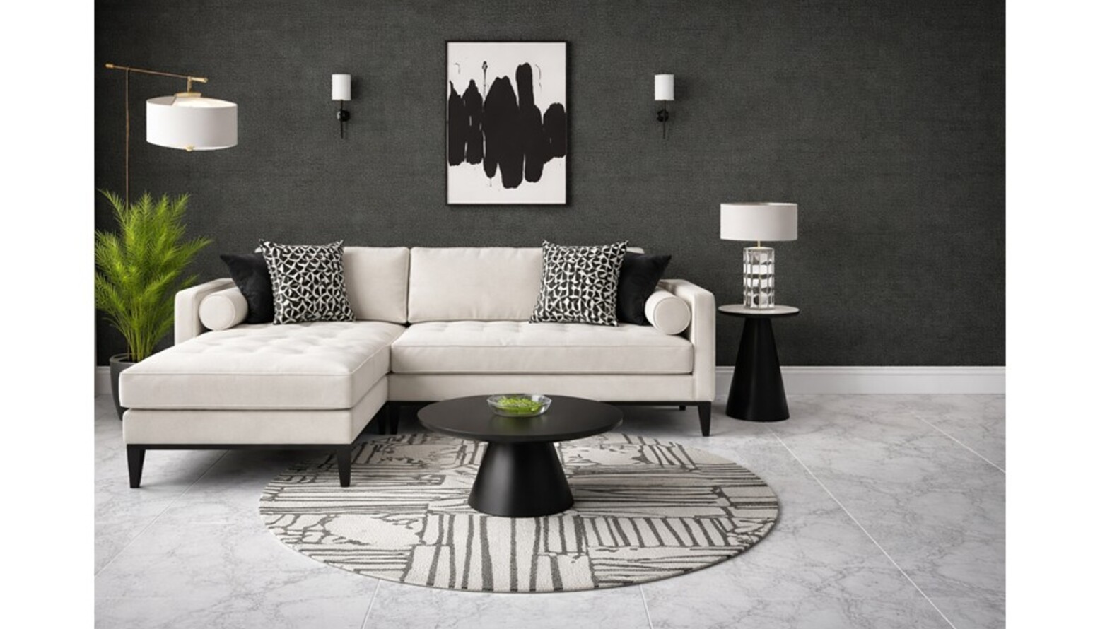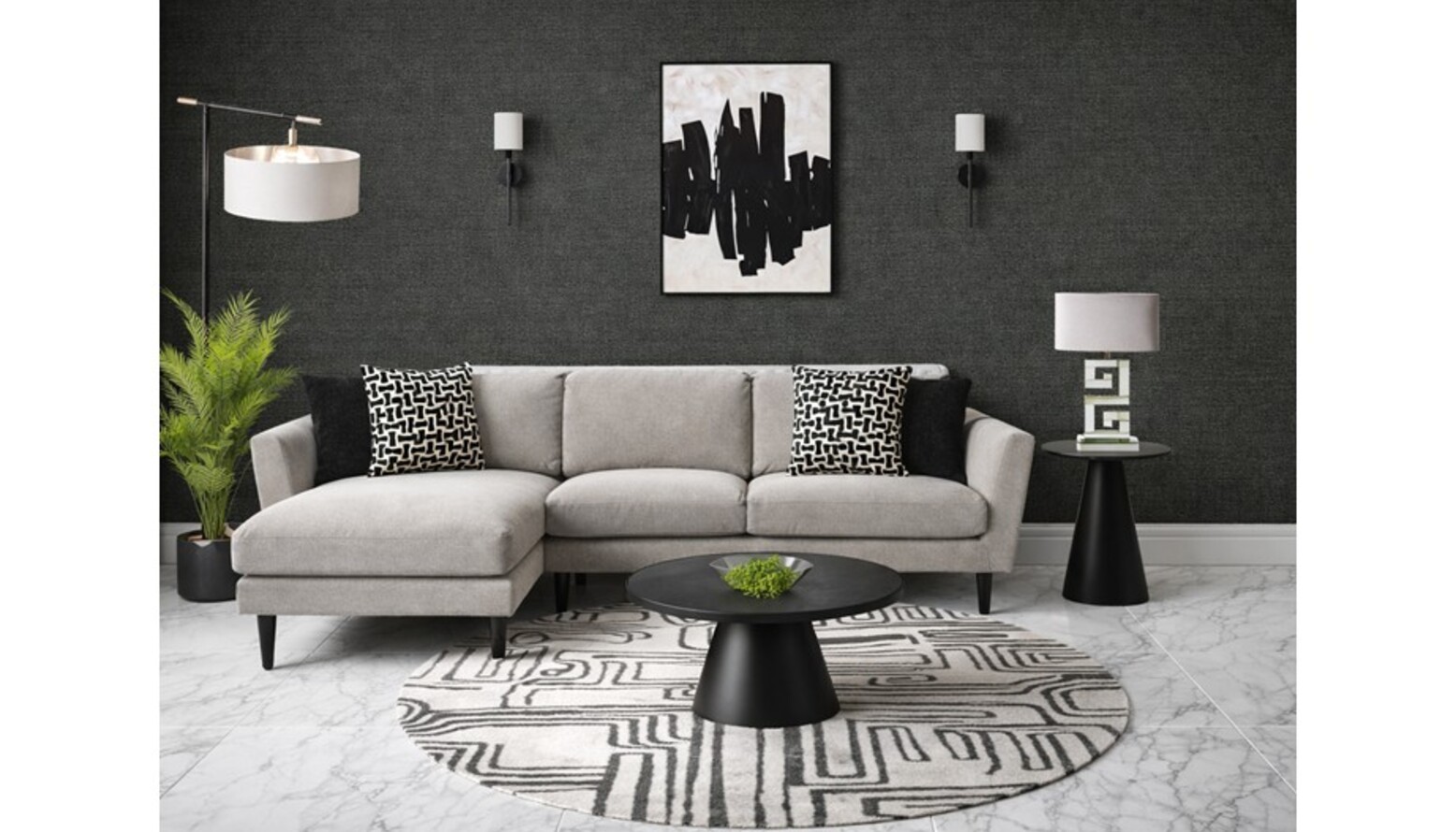 The central piece, a stunning 3-seater left chaise sofa in a soft bone color, offers comfort and elegance, accented by black and patterned cushions.