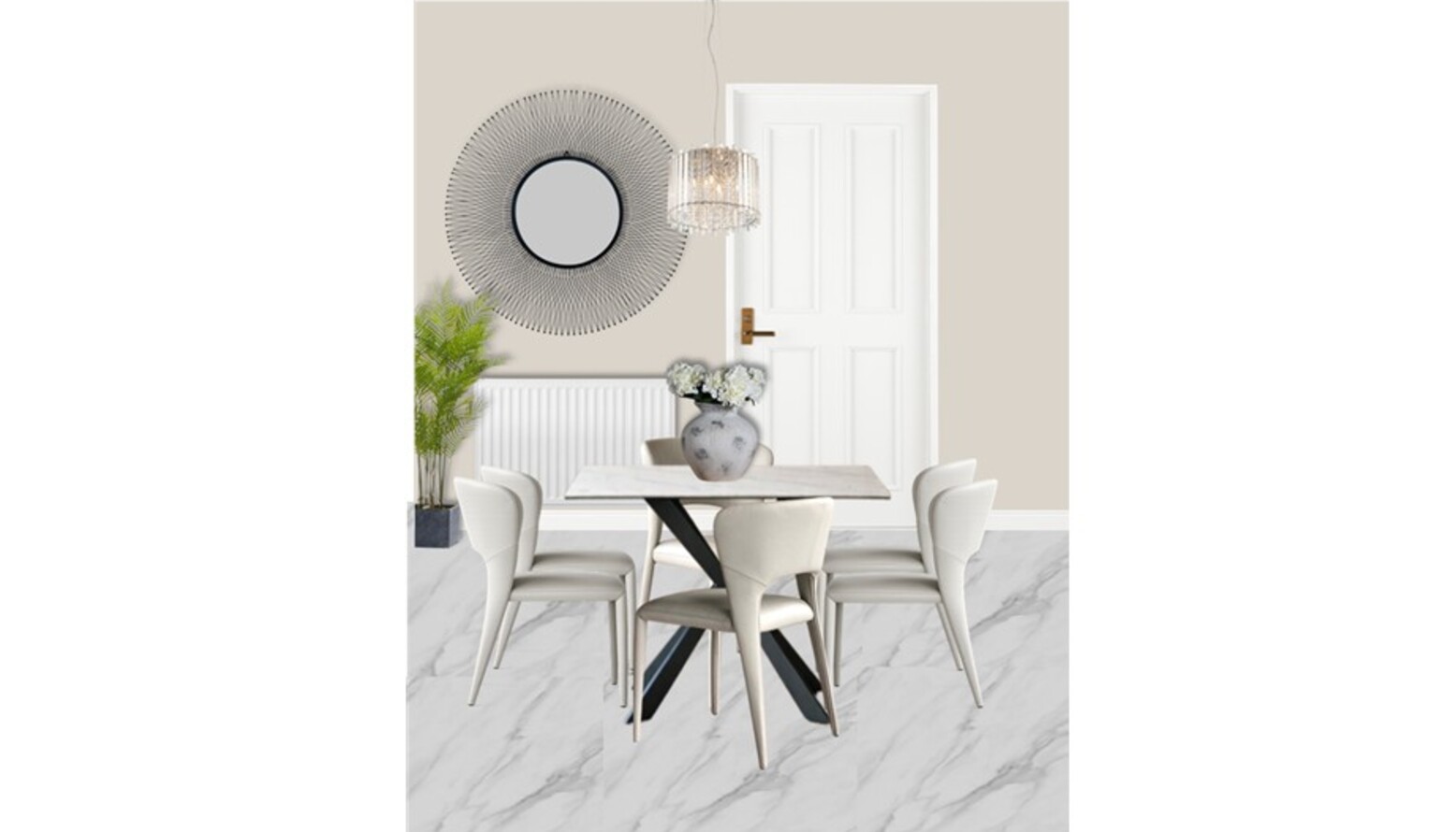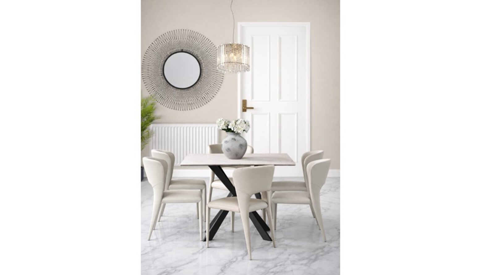 A striking six-seater dining table made from white ceramic and supported by a black metal starburst pedestal anchors the dining area, surrounded by contemporary light grey leather dining chairs that feature curved backrests and a sleek stainless steel footrest.