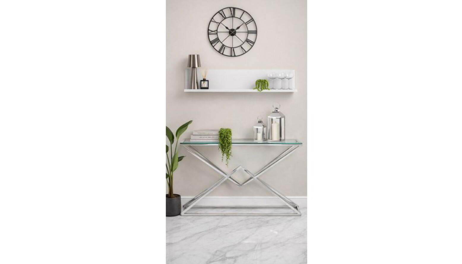 A tempered glass rectangular console table complements the modern aesthetic, while a unique round ceramic coffee table in black adds a focal point.