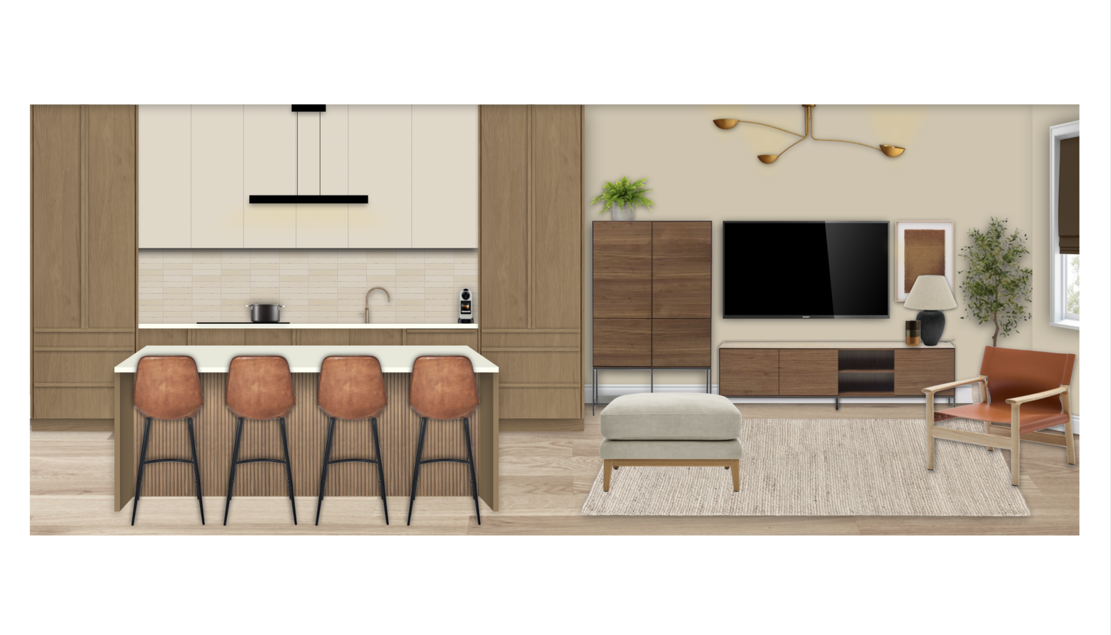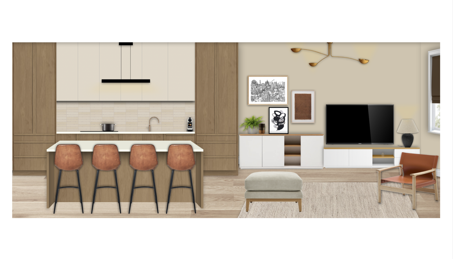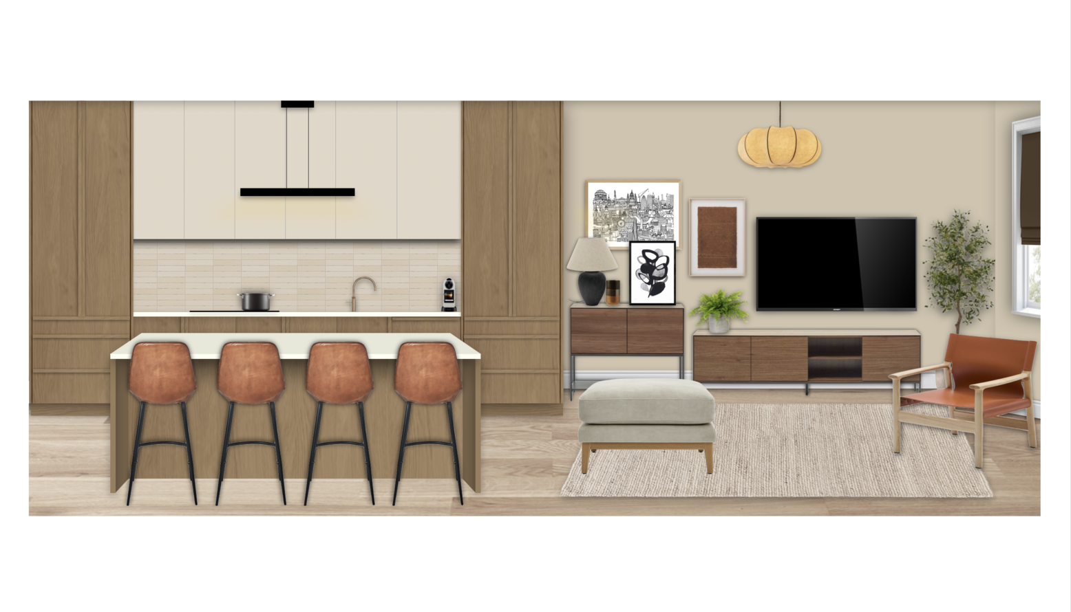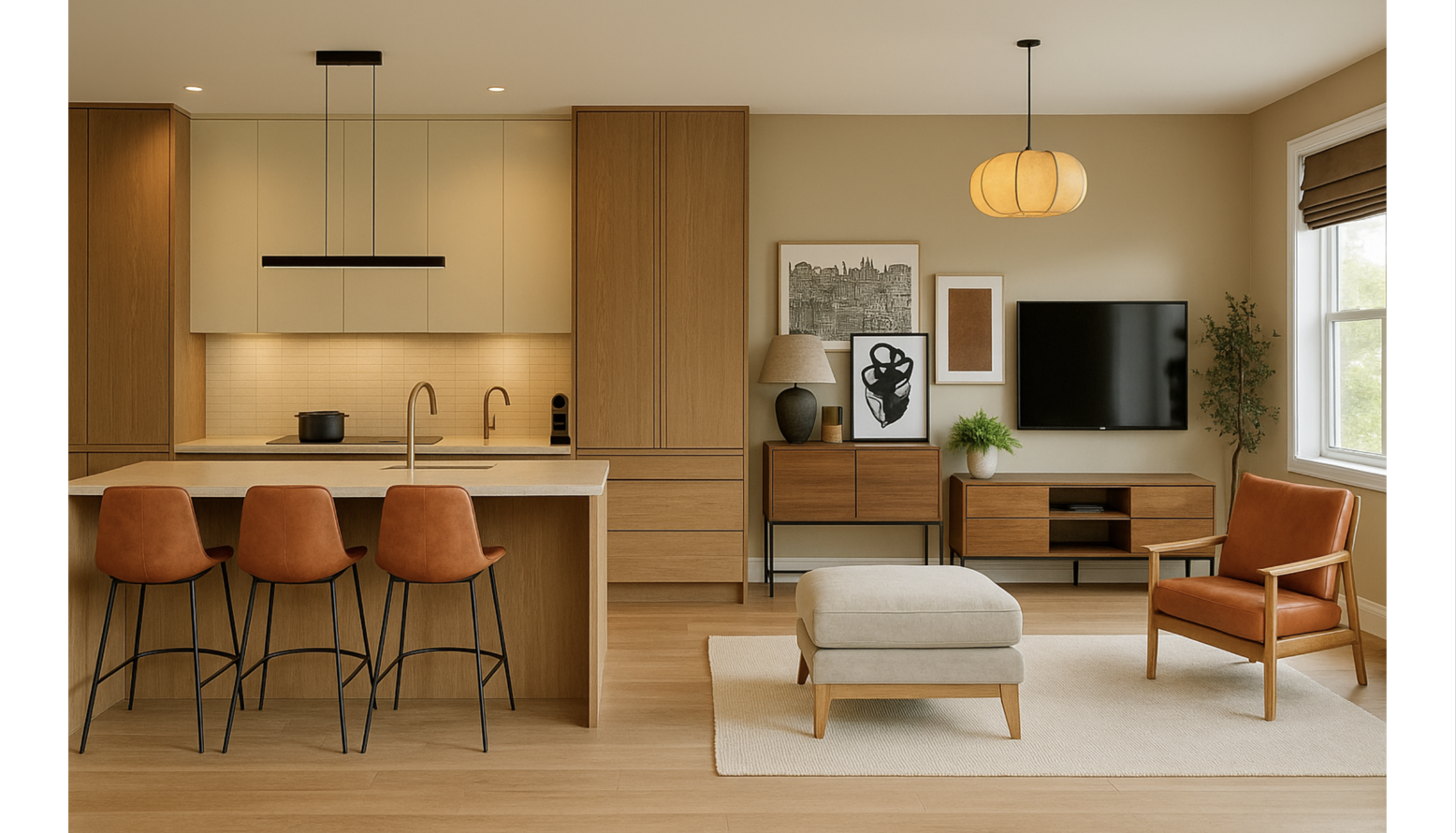 This triple function room seamlessly combines a kitchen, dining area, and living space, showcasing modern design elements throughout. The kitchen features sleek cabinetry in warm oak tones paired with cream-colored countertops, creating a light and inviting atmosphere.