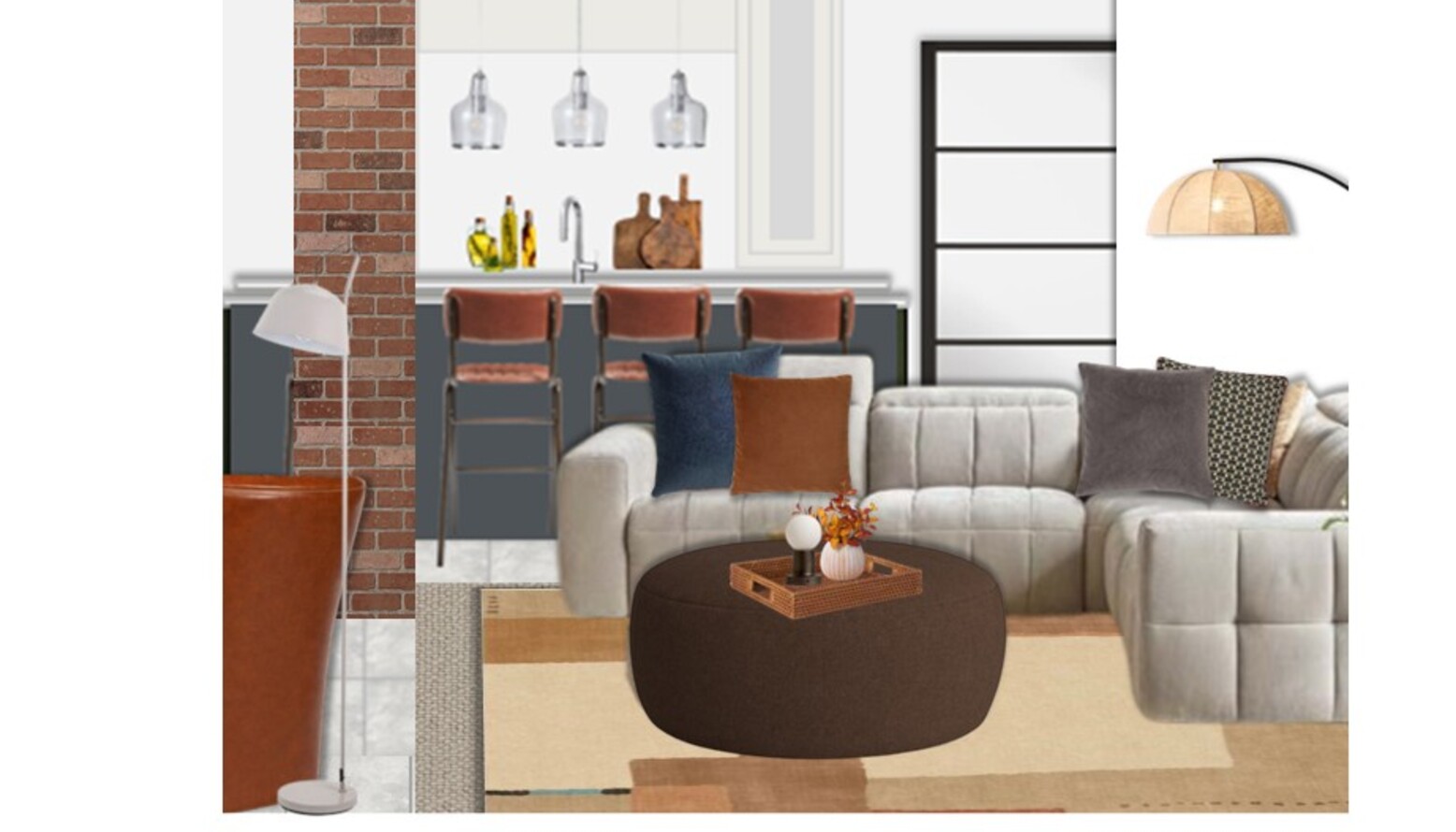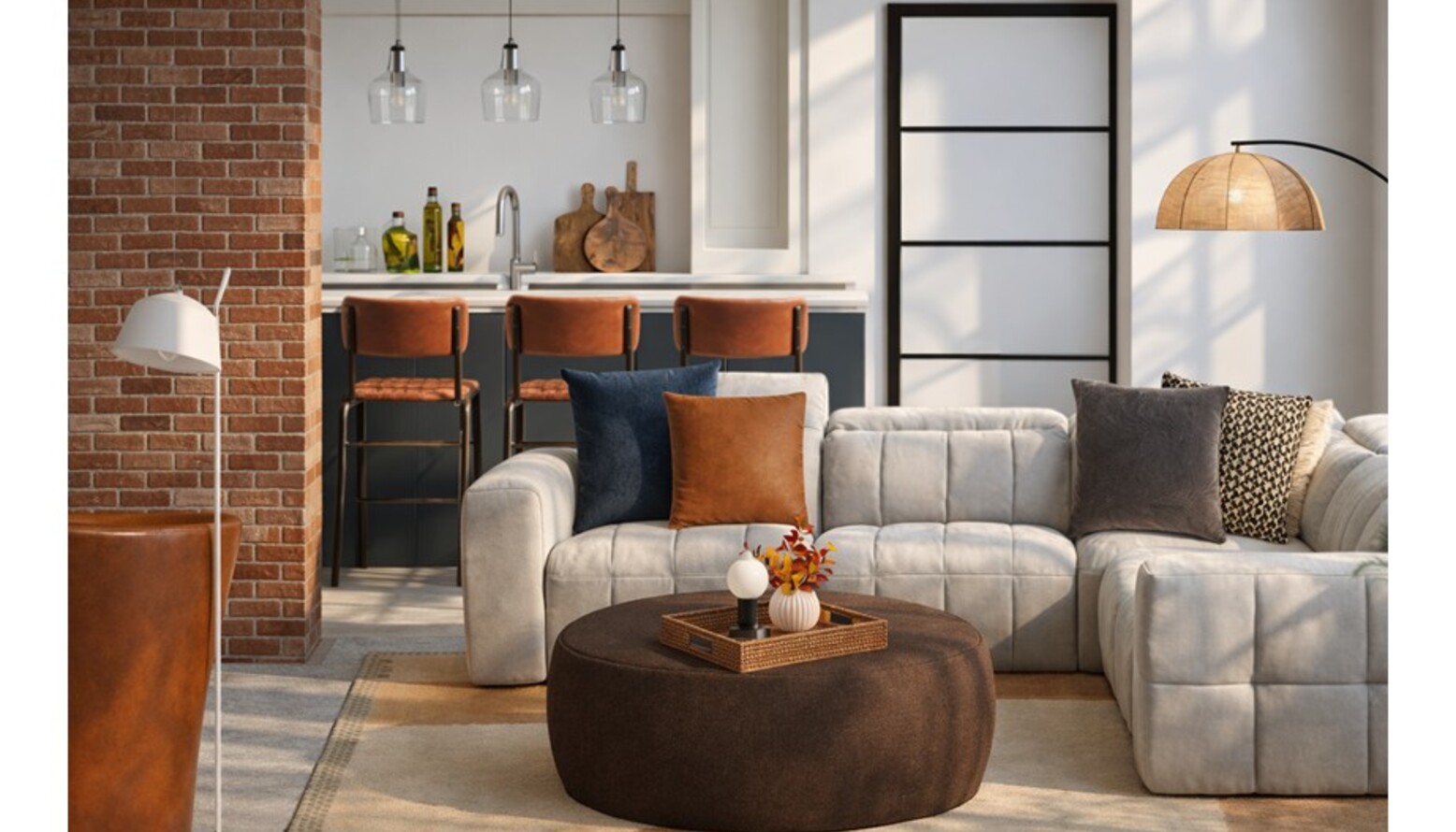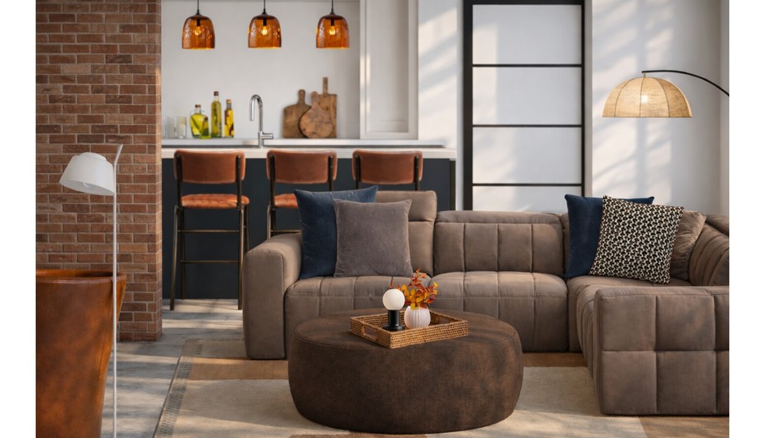 Illuminating the space, a stylish curved floor lamp in a warm ivory tone stands nearby, alongside contemporary pendant lights that hang above a sleek kitchen bar. The bar features high, tan stools that mirror the rich, warm palette throughout the room.