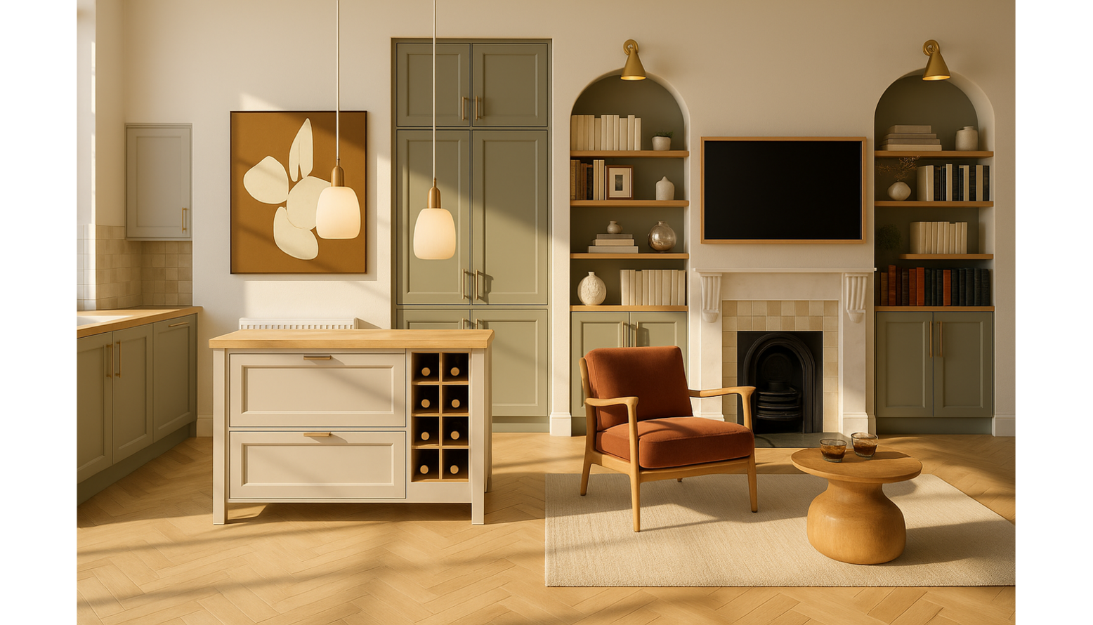 This triple-function room seamlessly blends the living, dining, and kitchen areas, creating a harmonious and inviting space. The walls are painted in soft neutral tones that enhance the natural light and warmth from the wooden flooring. A modern kitchen area features sleek cabinetry in a muted green with brass hardware, complementing the stylish wooden countertop on the island that also includes wine storage. Pendant lighting hangs softly above, providing functional illumination while adding to the decor. Adjacent to the kitchen, a cozy seating area is anchored by a circular wooden coffee table, perfect for casual gatherings. A standout feature is the burnt orange accent chair, providing a pop of warm color and comfort. Artfully positioned on the wall is a contemporary piece that features abstract shapes in earthy hues, drawing attention and enriching the aesthetic. On the opposite wall, a chic fireplace flanked by open shelving showcases decorative objects and books, enhancing the room's character. The light fixtures, including a stylish chandelier and task wall lights, contribute to a layered lighting effect, making the space feel warm and welcoming. Overall, the design reflects a modern yet timeless style, incorporating elements that offer functionality and beauty, ideal for dining, entertaining, and relaxation.