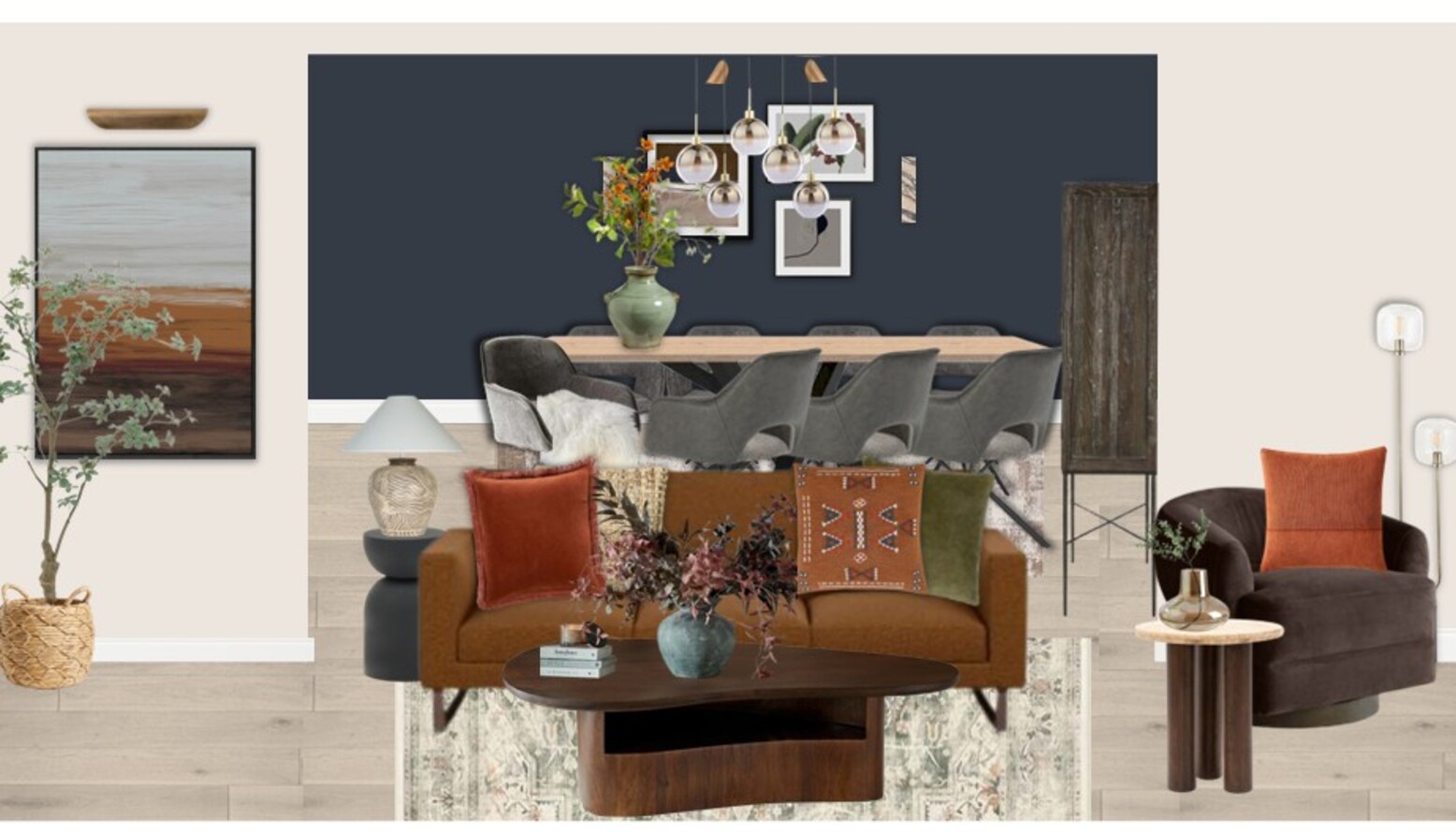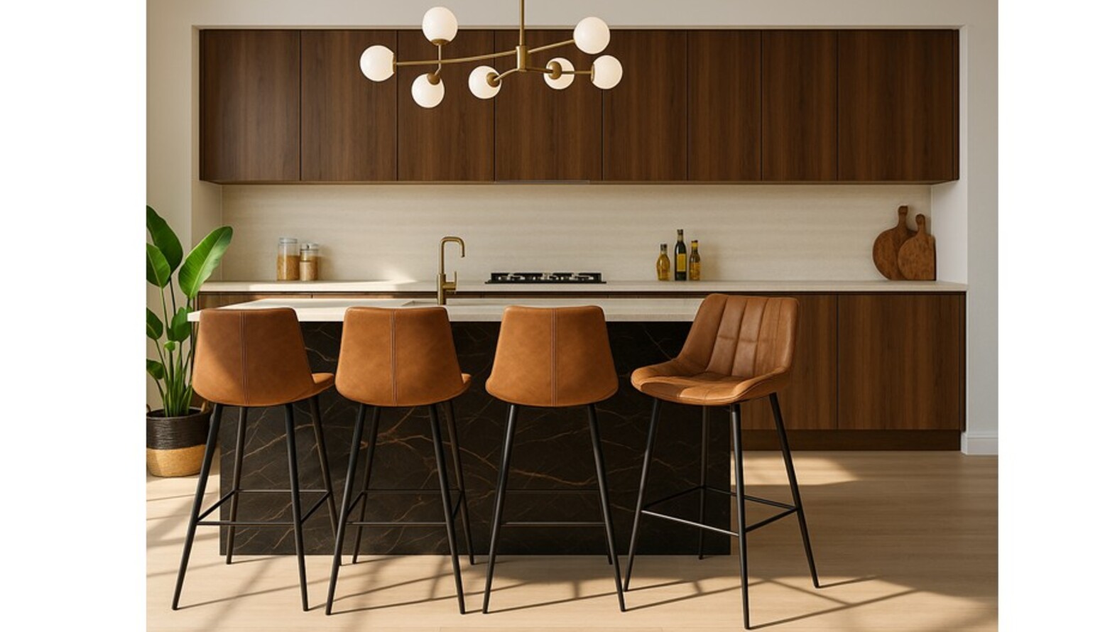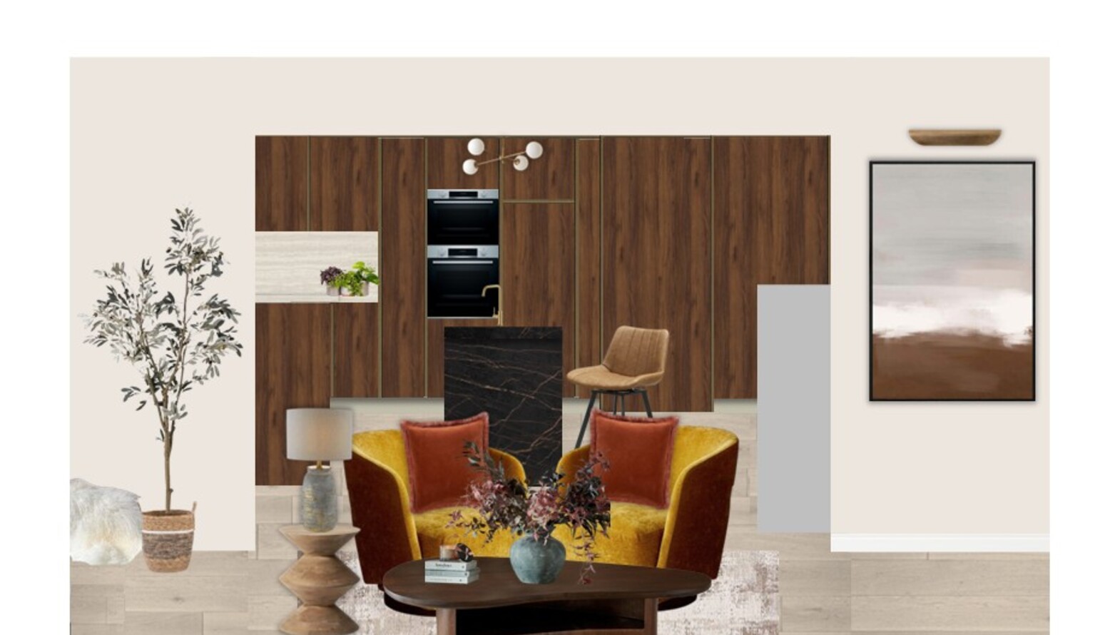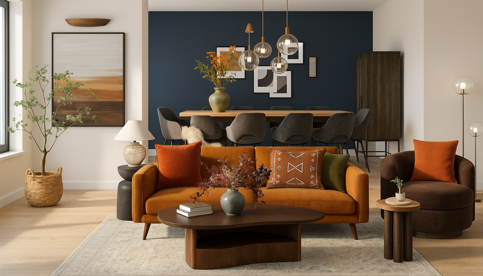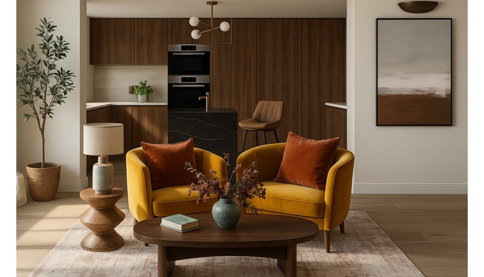 This triple-function room seamlessly combines living, dining, and kitchen areas, creating a cohesive and inviting atmosphere. The space is anchored by a stylish kitchen featuring rich wooden cabinetry that contrasts beautifully with a white countertop. An elegant, extendable dining table sits at the center with comfortable, textured dining chairs that enhance the inviting aura. Overhead, distinct lighting fixtures provide both functionality and style, including a cluster pendant that acts as a focal point. The bar seating, with tan leather stools, invites casual gatherings or quick meals, reinforcing the room's multifunctional design. The soft hues and natural materials add warmth, while carefully selected plants bring an organic feel, complementing the modern aesthetic. Textured rugs and cushions introduce depth and comfort, contributing to the inviting ambiance of this multifunctional haven.