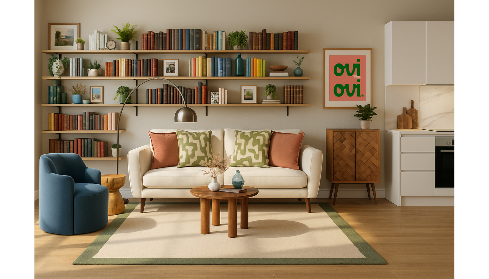 This open plan living space boasts a warm and inviting atmosphere, ideal for both relaxation and entertainment. The focal point of the room is a stylish, plush cream sofa adorned with decorative cushions in green and rust tones, adding a pop of color. In front of the sofa, a unique round coffee table made of natural wood with three stout legs offers ample space for drinks or books. Below, a soft, light-colored rug framed with a green border warms up the hardwood floor, creating a cozy area for gathering. Against one wall, an elegant tall black metal bookcase showcases an array of colorful books and decorative items, providing both storage and a personal touch to the decor. Complementing this is a sleek sideboard with a beautiful burnt wax finish, enhancing the room's earthy tones. A striking wall-mounted piece of art adds character, featuring bold colors that harmonize the space. A modern arc floor lamp gracefully bends over the seating area, providing soft lighting while maintaining an airy feel. In one corner, a blue velvet accent chair creates a comfortable nook for reading or conversation, pairing perfectly with a small wooden side table. Thoughtfully placed plants, both real and artificial, bring life and fresh aesthetics to the room. Finally, the window is dressed with elegant tab top curtains, providing light control without sacrificing style. Overall, this dual-function space is beautifully designed for functionality and aesthetic appeal.