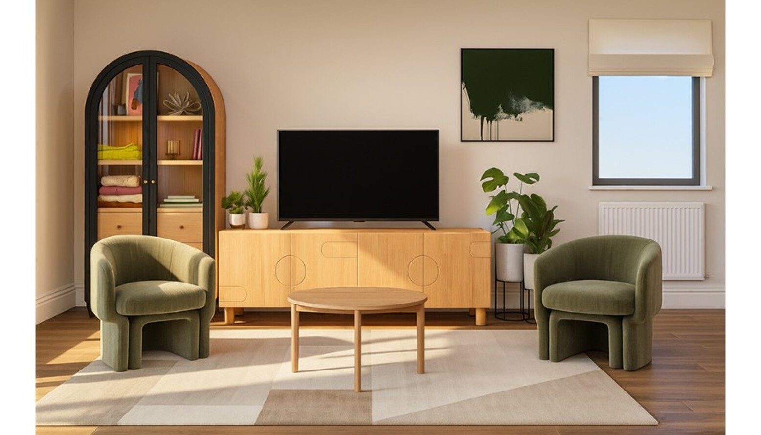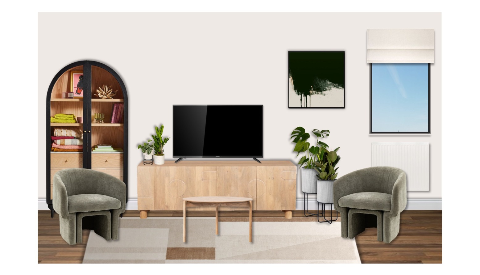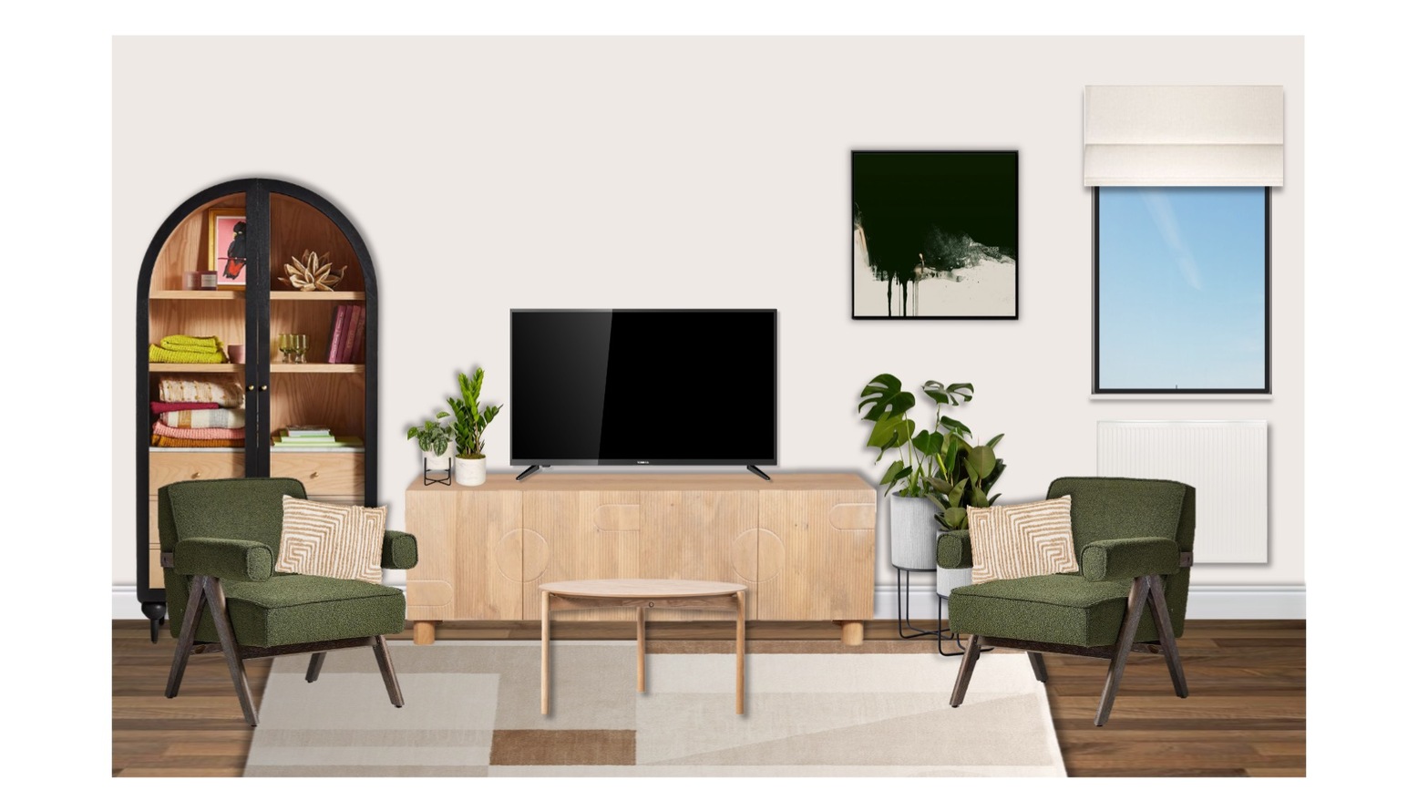 To the side, a Housten 2 Door Drinks Cabinet showcases its curved wood design while providing functional storage. Flanking the cabinet are a selection of greens, including real or faux plants in stylish planters, bringing a touch of nature indoors. A pattern from the wall art in earthy tones complements the overall palette.