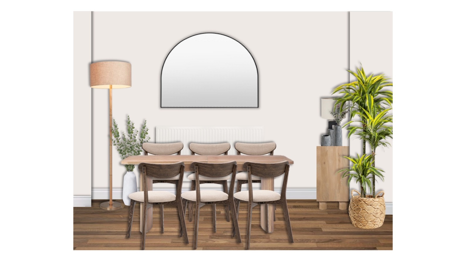 For dining, the Panelled Dining Table is positioned to allow for intimate meals, paired with Hatfield dining chairs in a smoked finish, creating a cohesive look.
