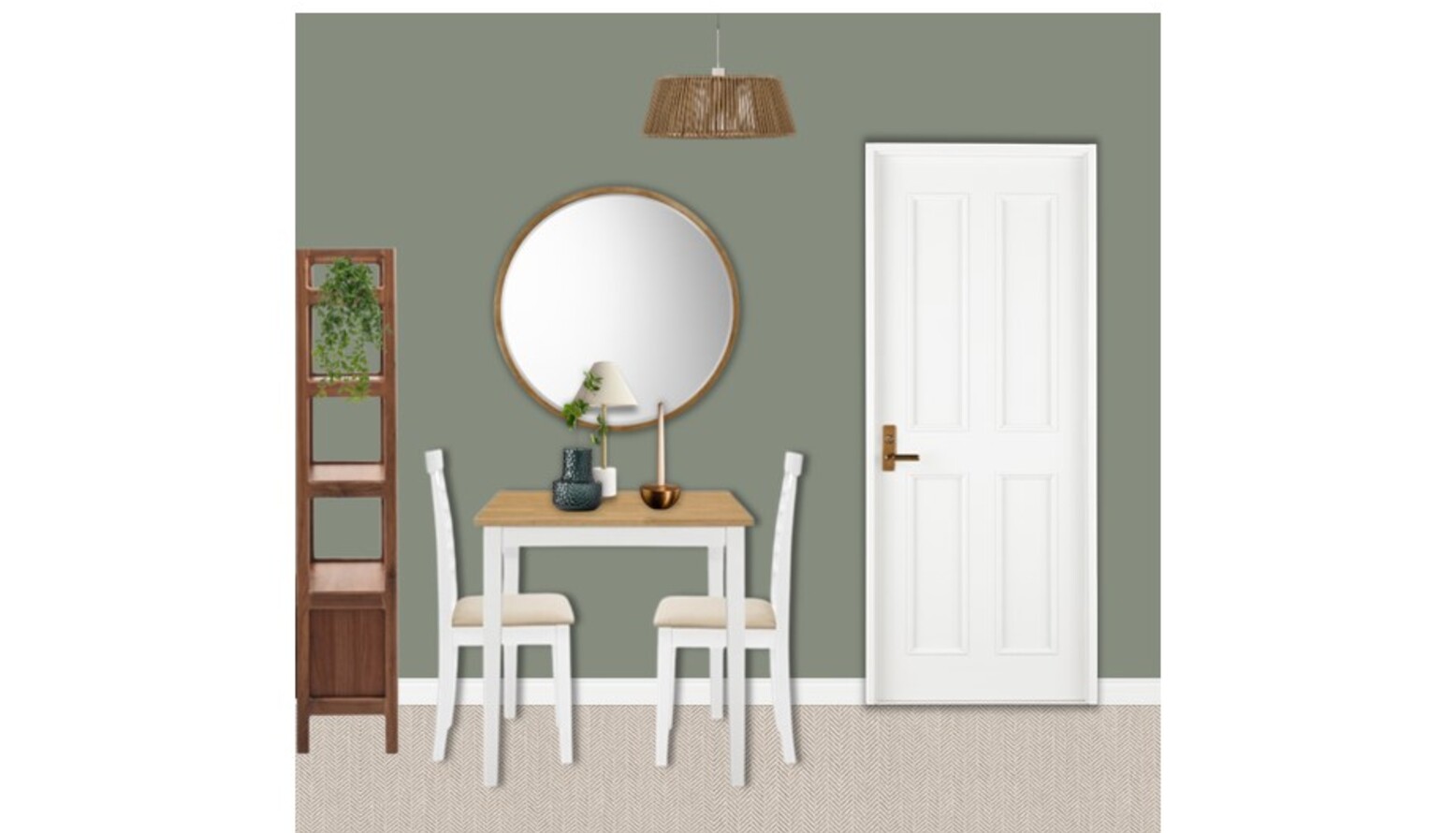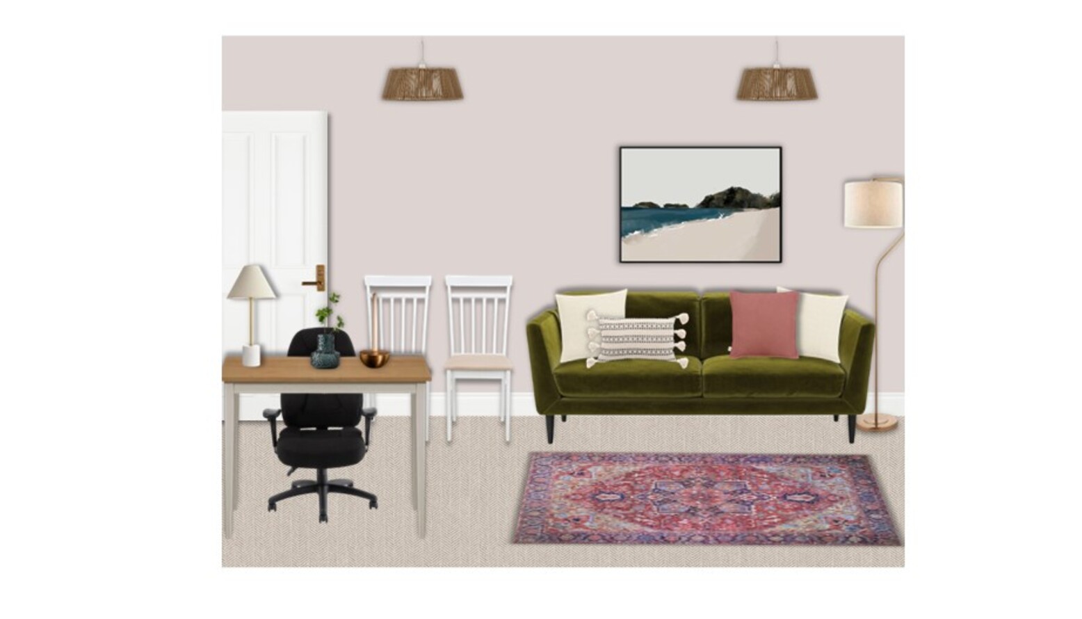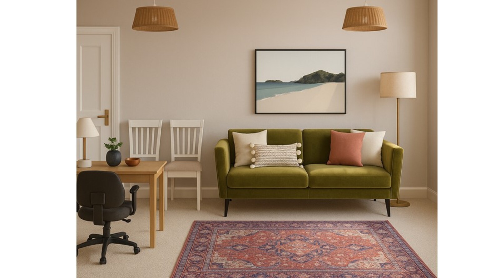 This dual function room blends living and dining areas seamlessly. The focal point is the stylish olive green 2.5 seat sofa, accentuated with a pink corduroy cushion, and a white textured pillow with pom-poms. A soft area rug with intricate patterns adds warmth underfoot, introducing an inviting touch. Adjacent to the seating area, a light wood dining table is accompanied by classic white chairs, providing a contrast to the sofa. The table is adorned with minimalistic décor, including a sleek vase and a decorative bowl, making it suitable for both dining and casual gatherings. A tall, slender floor lamp with a beige shade stands near the sofa, offering overhead lighting without overwhelming the space. Above, the ceiling features woven lampshades that bring an organic and harmonious feel. Decorative elements encompass artwork depicting a serene beach landscape, enhancing the room's calm ambiance. Additionally, shelving units, including the walnut Berlin display unit, provide ample storage and display space. Each unit offers a combination of function and style, adding character to the environment. A round antique gold mirror reflects light and visually expands the space, while a small potted vine adds a touch of greenery, fostering a lively atmosphere. Overall, this room is designed for comfort and functionality, perfect for both relaxed lounging and engaging dining experiences.