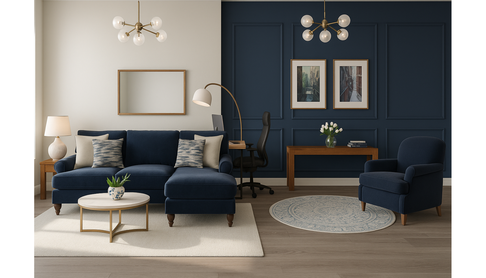 An elegant armchair in matching navy complements the sofa, creating a cozy reading nook. The workspace is defined by a wooden desk that flows seamlessly with the décor, paired with a sleek black office chair offering comfort during prolonged use.