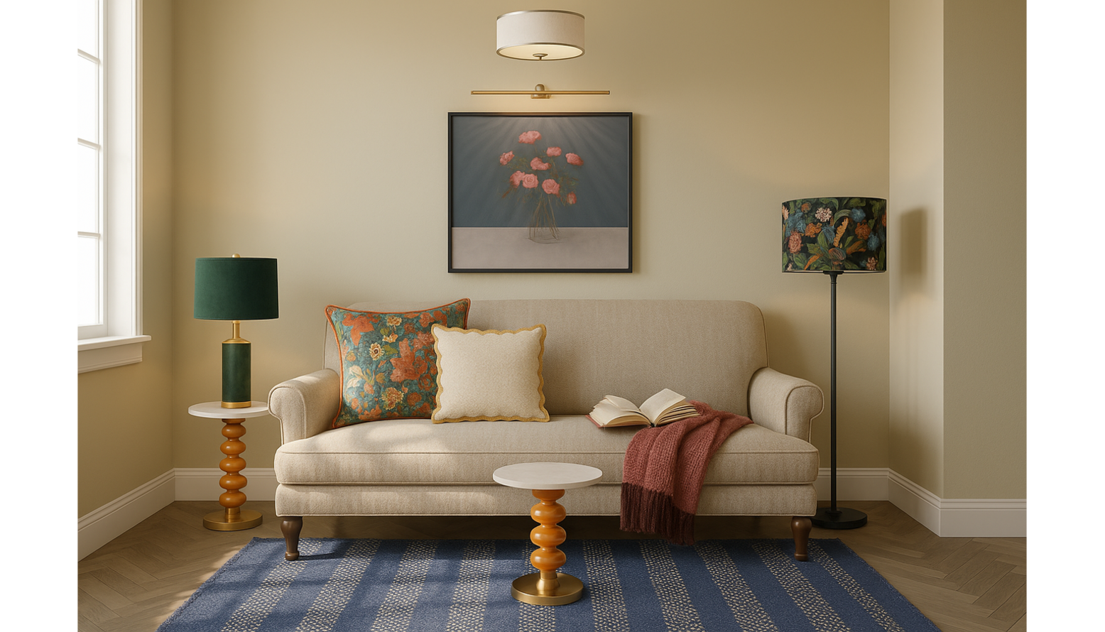 Artwork with soft colors frames the dining area, tying together the room's aesthetic. A floor lamp and ambient lighting elevate the room’s sophistication, while faux plants introduce a hint of nature, completing the look.