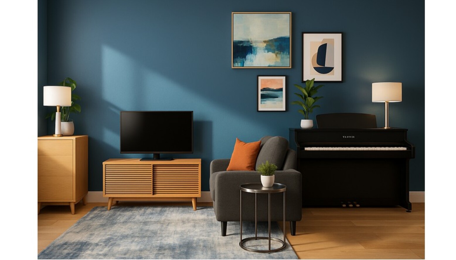 Overall, the room balances functionality with aesthetic appeal, perfect for both hosting gatherings and quiet evenings at home.