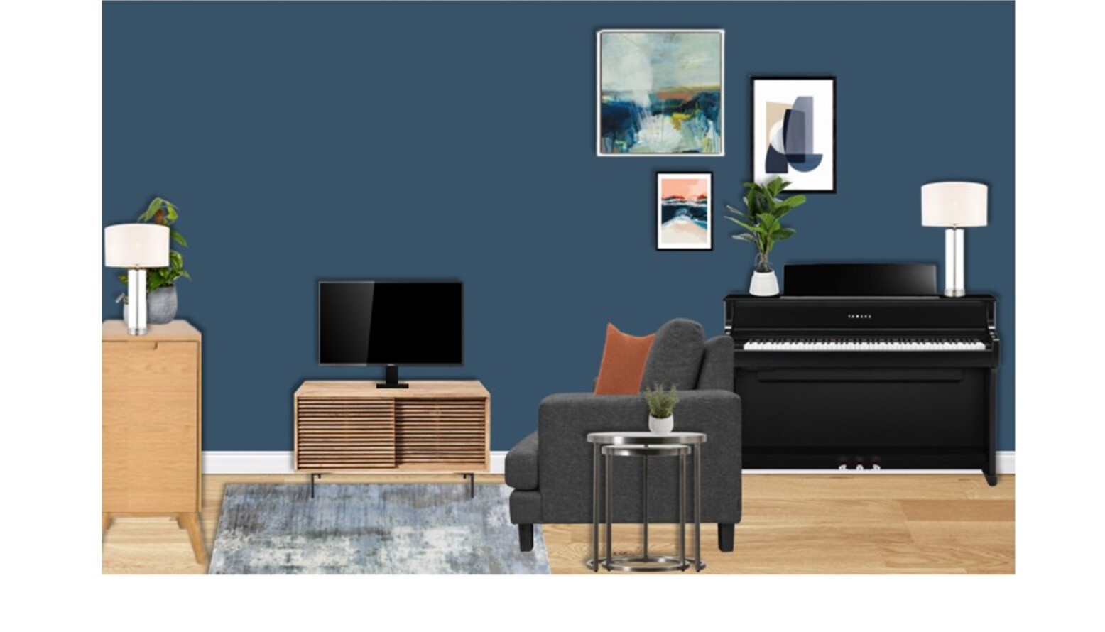 Illumination is provided by the Lessina Table Lamp in Bright Nickel, adding a chic touch next to a flourishing plant that brings life to the corner. The flooring is adorned with a Gatsby area rug in Navy, offering a cozy and stylish feel underfoot.