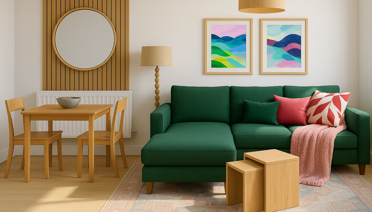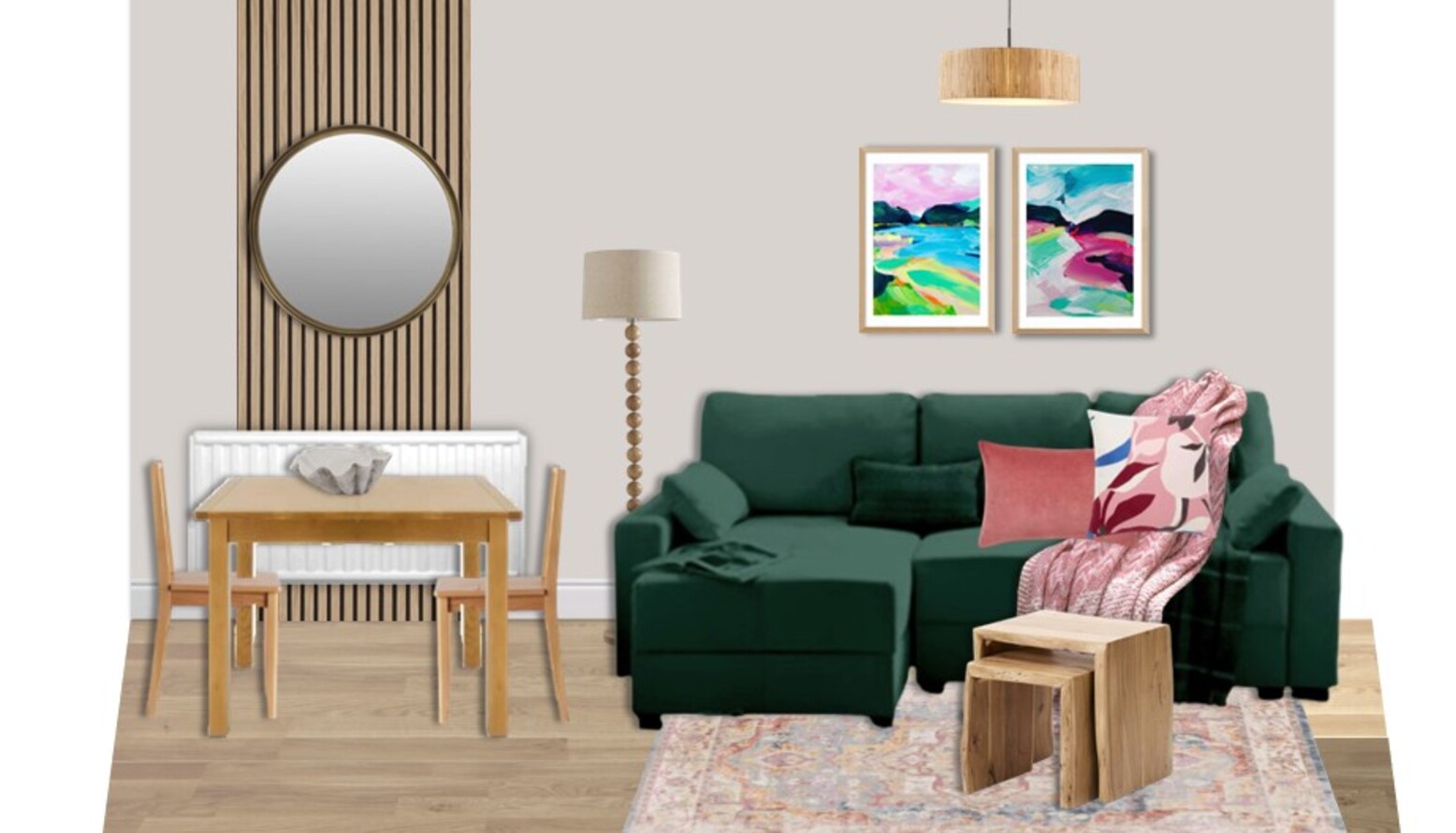 This dual-function living and dining room seamlessly combines comfort and style. A vibrant green sofa with a variety of cushions in dusky pink and deep green hues invites relaxation.