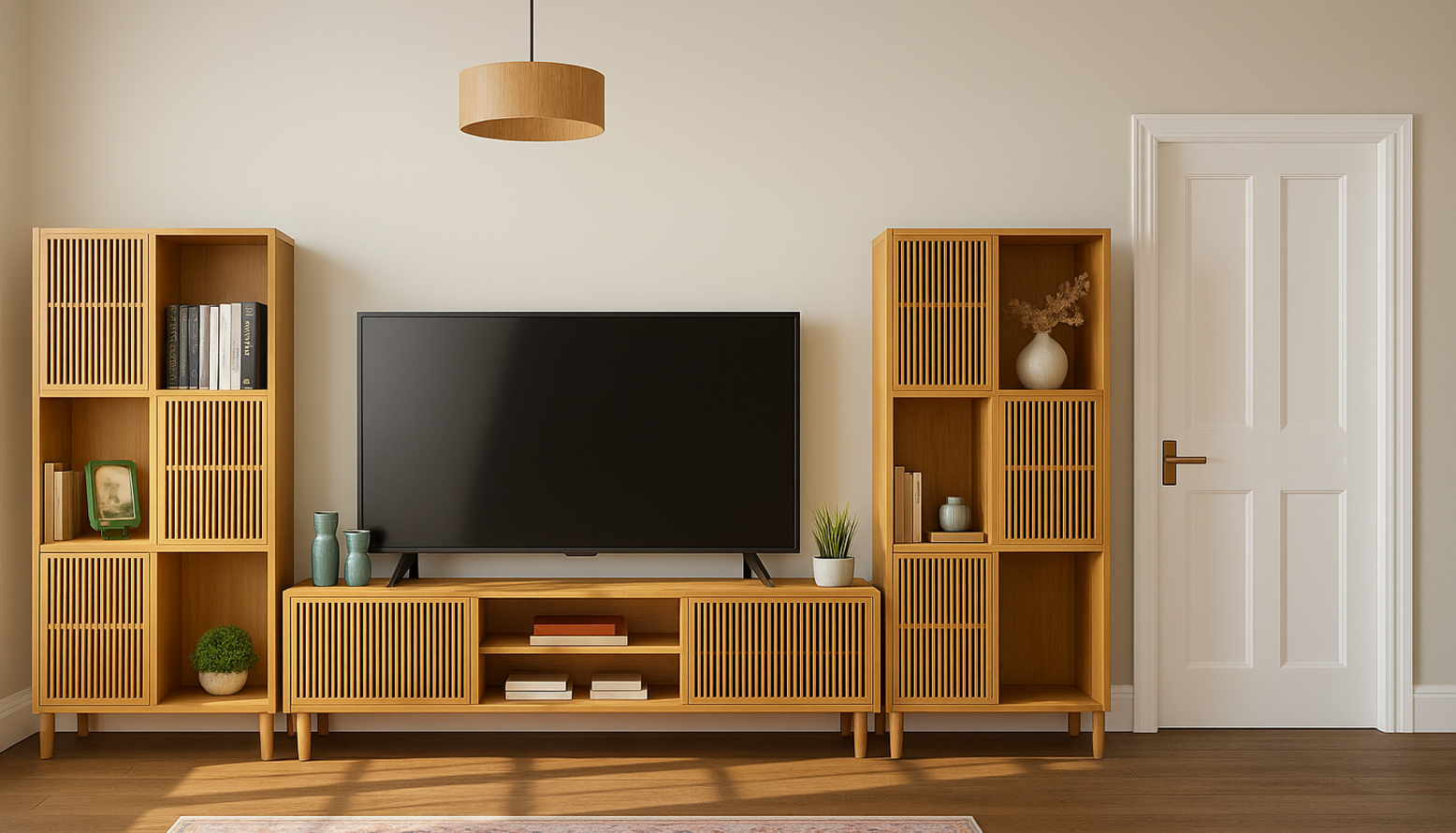 Subtle accent features include a wooden floor lamp beside the sofa, casting a warm glow, and two nesting side tables, perfectly designed for versatility.