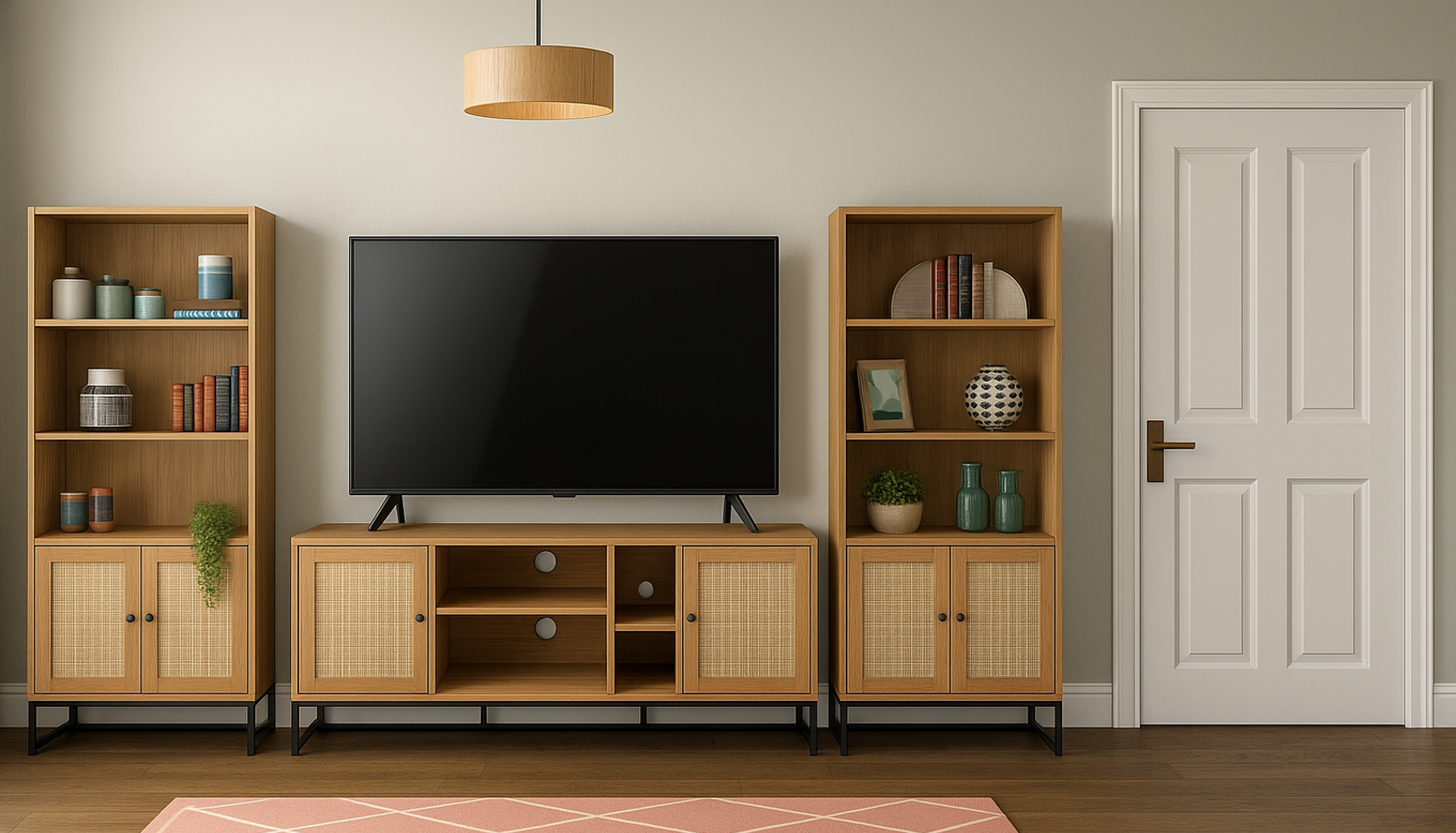 Additionally, a range of decorative items adds character, such as a ceramic vase with artificial flora, a stylish cloche table lamp, and distinctively designed bowls and jars.