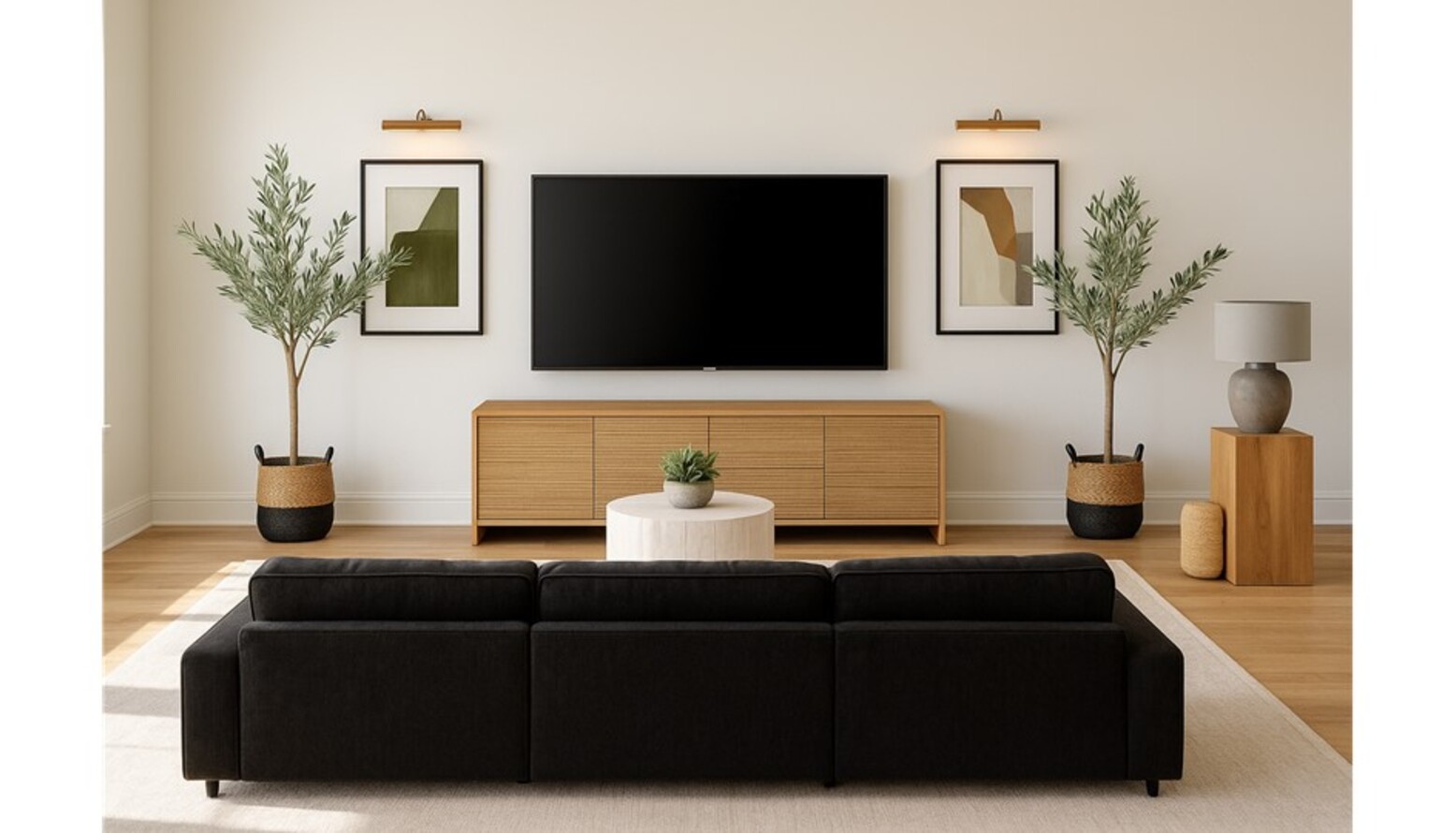 This living-dining room design features a harmonious blend of functionality and style, creating an inviting atmosphere. Warm wooden flooring sets the foundation, enhancing the spacious feel of the area. The dining table, a striking centerpiece, is accompanied by a set of six upholstered chairs in a soft taupe hue, offering comfort and elegance for family gatherings or entertaining guests. Above the table, a chic linear pendant light adds a modern touch while providing ample illumination. Adjacent to the dining arrangement, two green chairs provide additional seating, inviting relaxation and conversation. A stunning sideboard, with its sleek lines and minimalistic design, serves as both storage and display space. Artwork framed in a rich hue hangs on the wall, contributing a sophisticated focal point that complements the natural light pouring in through large windows. An olive tree in a stylish pot brings a hint of nature indoors, enhancing the fresh ambiance of the room. Textiles, including a woven rug and soft cushions, introduce texture and coziness, ensuring the room is as welcoming as it is functional. Overall, the space effectively balances practicality and aesthetics, perfect for daily living and special occasions alike.