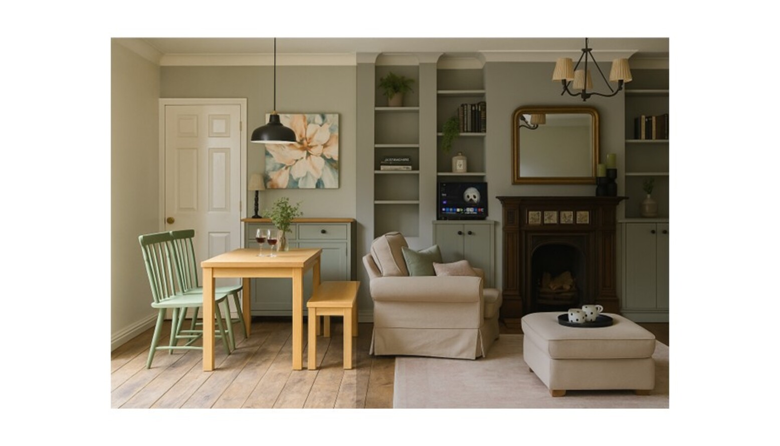 This dual-function room beautifully combines living and dining spaces, creating a cozy yet functional environment.