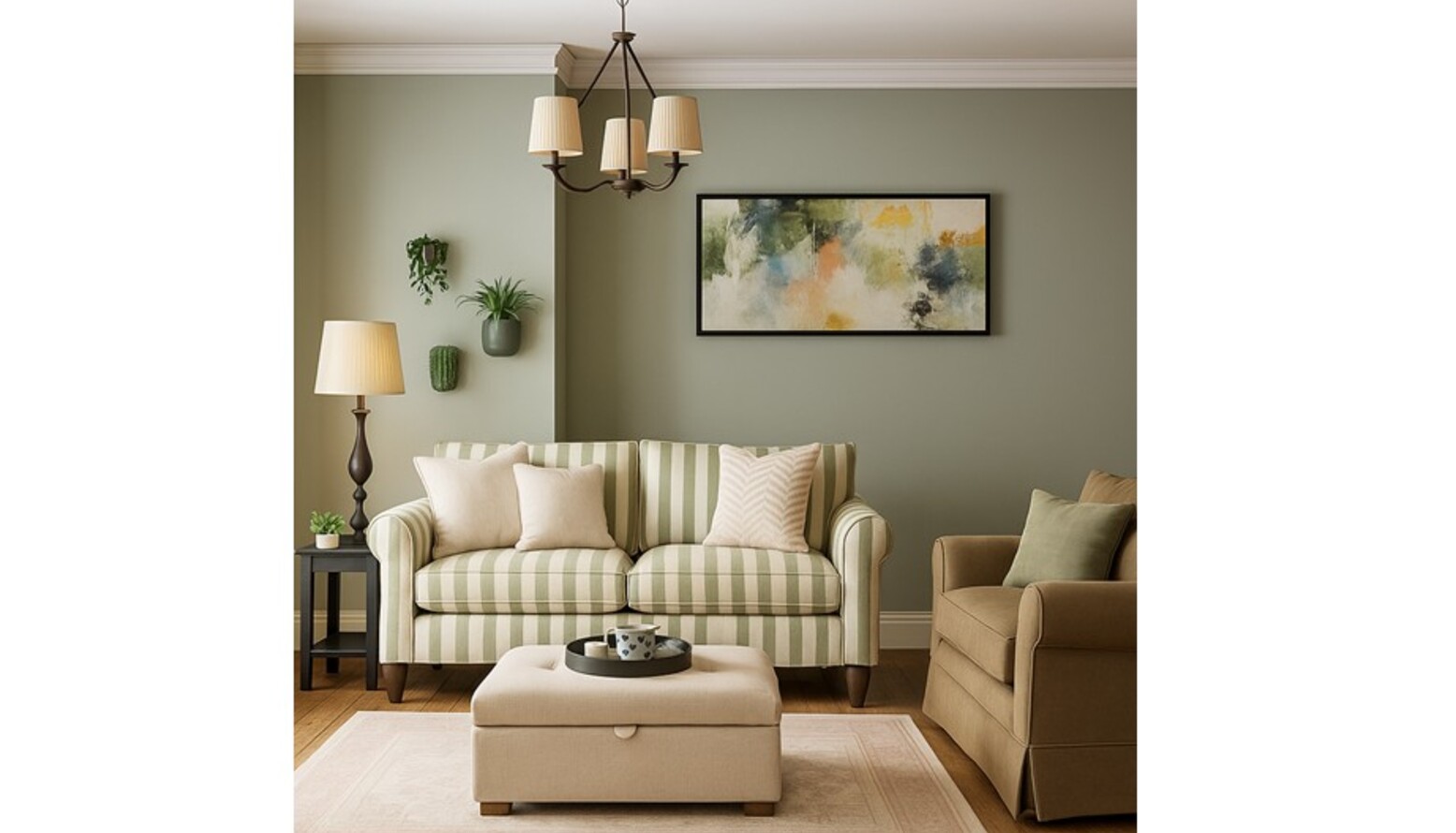 The color palette features soft, muted tones with an elegant grey-painted wall that hosts a lovely floral canvas, adding a touch of artistry.