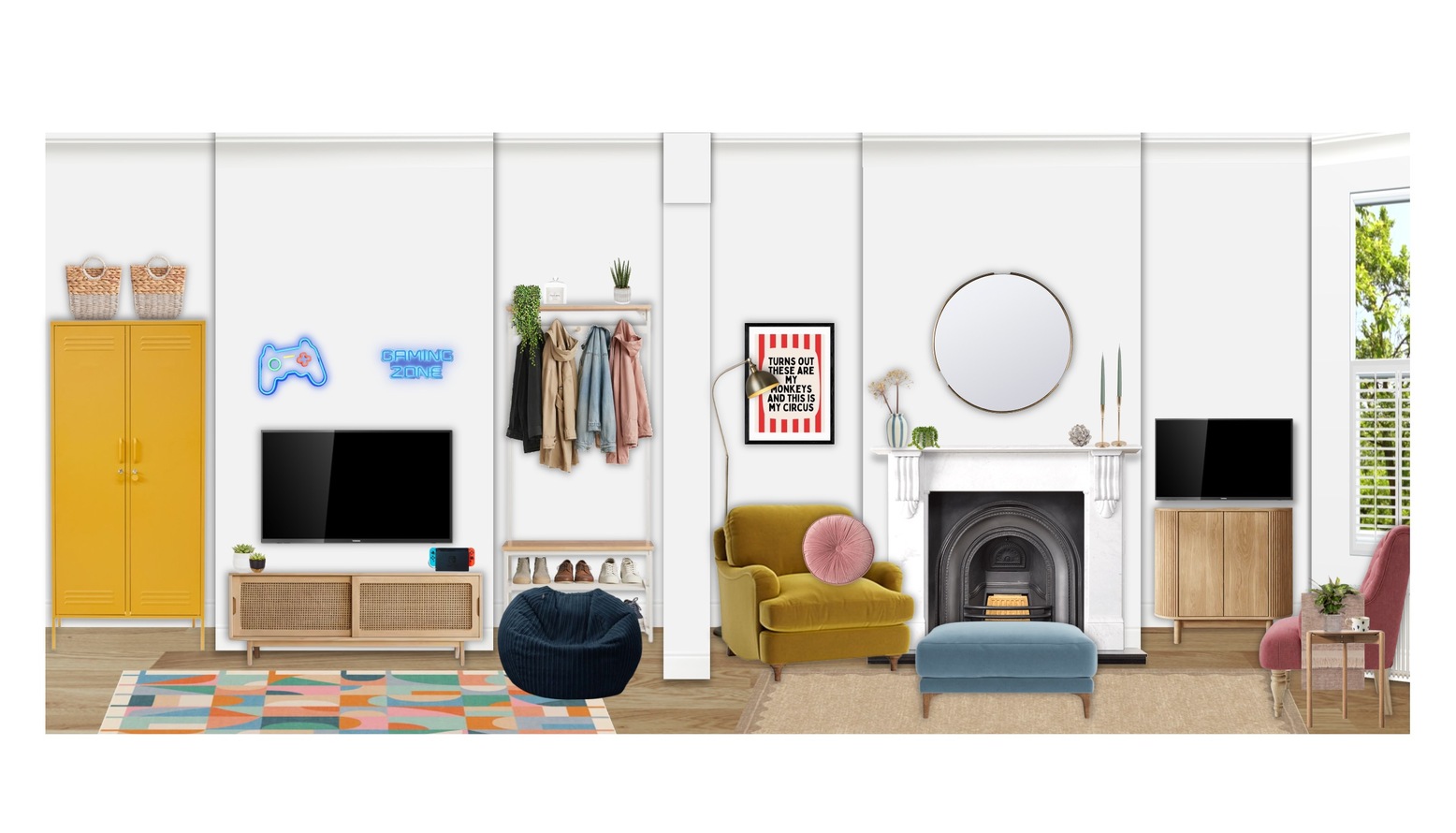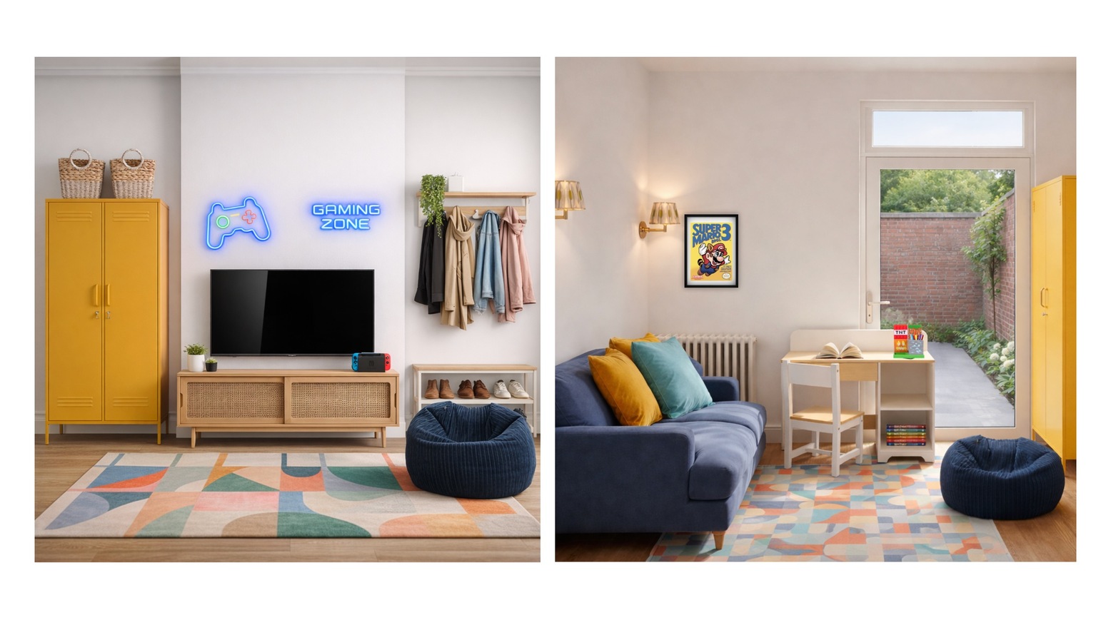 Lighting choices include a floor lamp in antique brass and an elegant wall fitting, which add warmth and sophistication. For an added whimsical touch, a game controller neon sign enhances the playful character of the room.