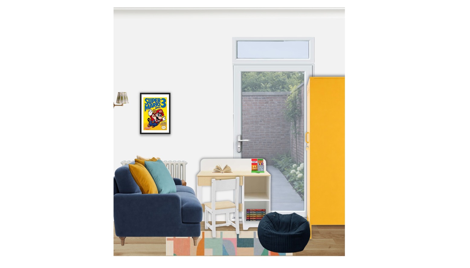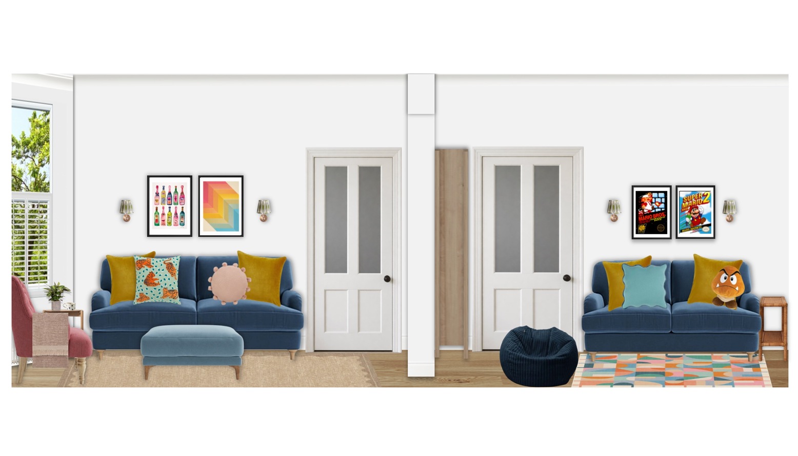 The living/playroom boasts a harmonious blend of vibrant and soothing elements, designed for both relaxation and play. A striking blue velvet small sofa serves as the centerpiece, adorned with colorful cushions that introduce playful textures and patterns. A complimentary blue velvet medium sofa and a yellow velvet armchair provide ample seating, creating an inviting atmosphere for both adults and children.