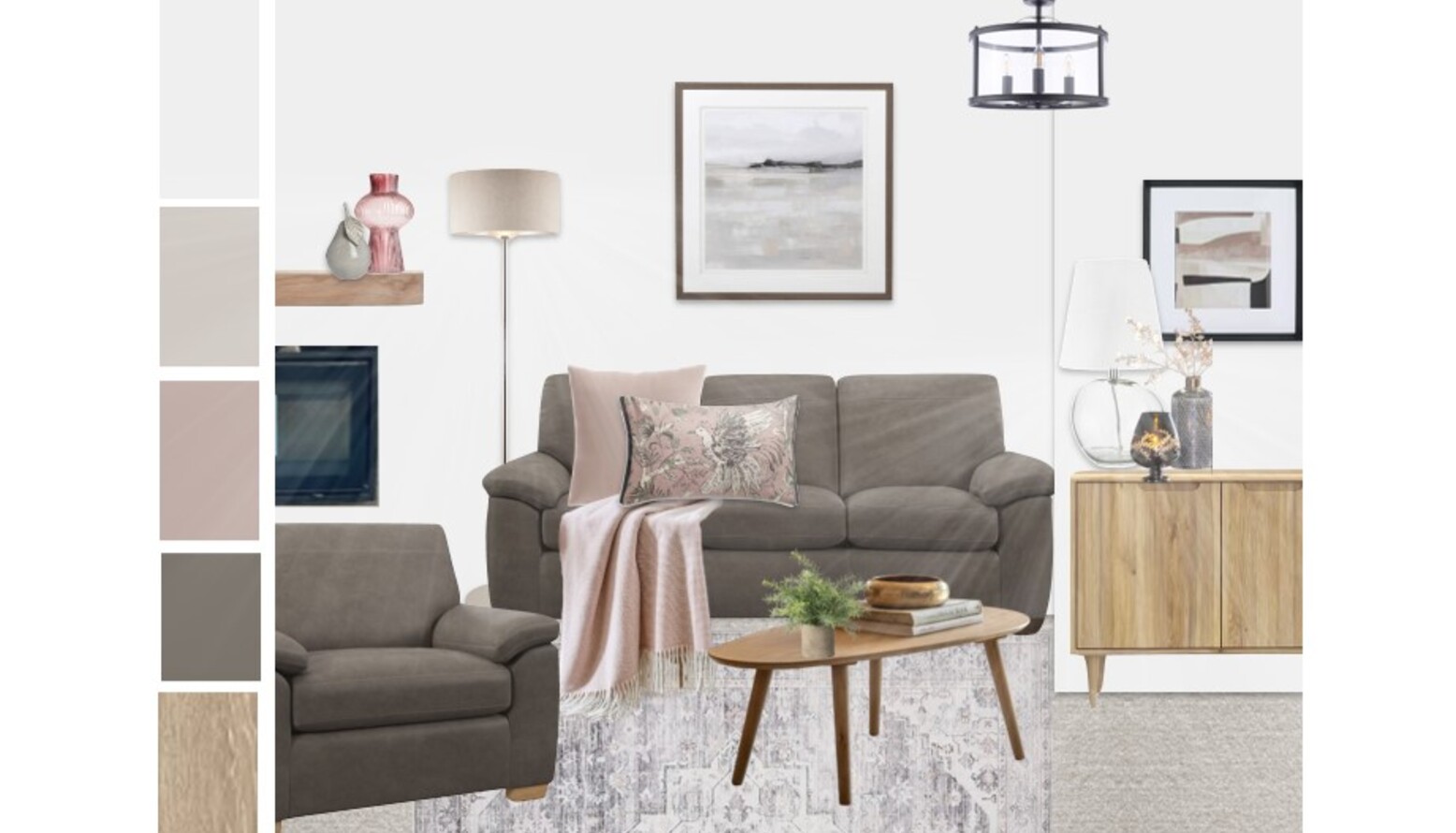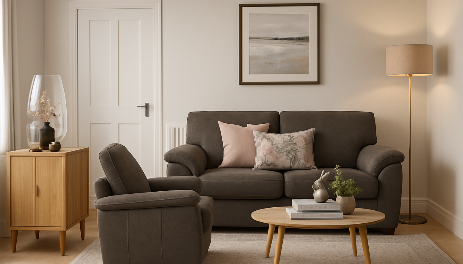 In the background, a stylish oak sideboard provides storage while maintaining a light aesthetic. A brushed chrome floor lamp adds warmth and illumination, casting a gentle glow across the room. Soft textiles like the bouclé throw enhance the tactile experience, draped casually over the sofa.