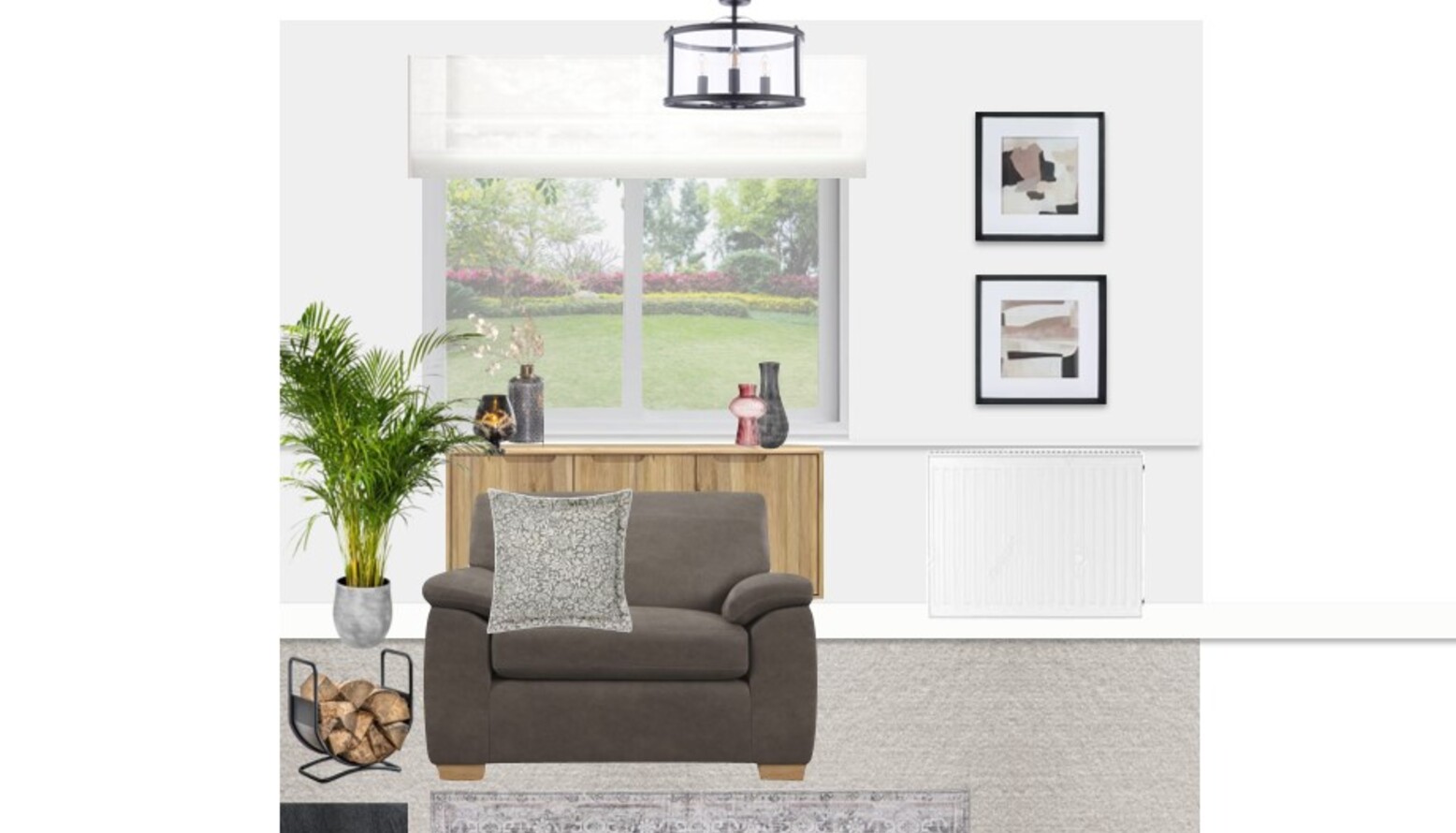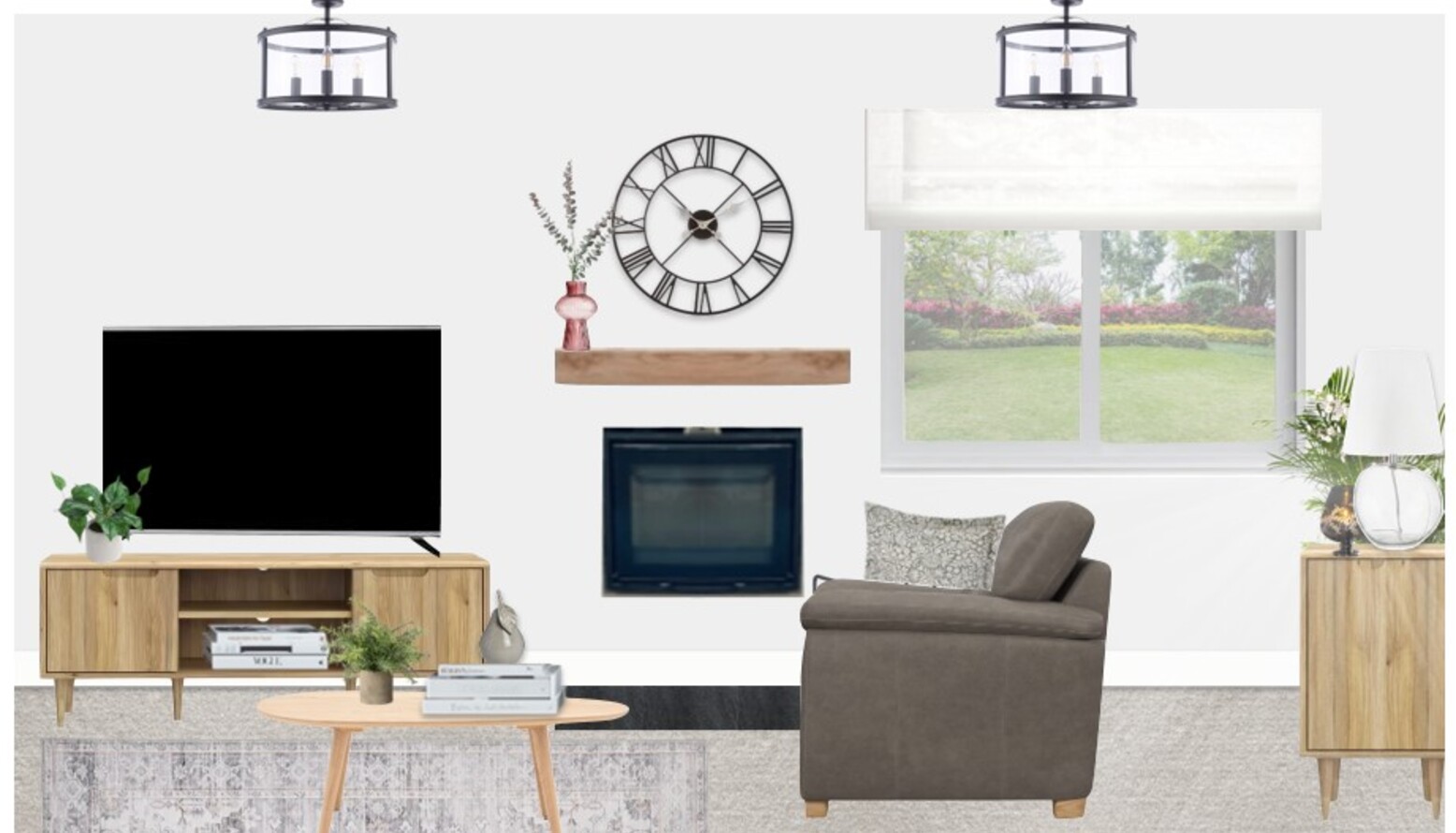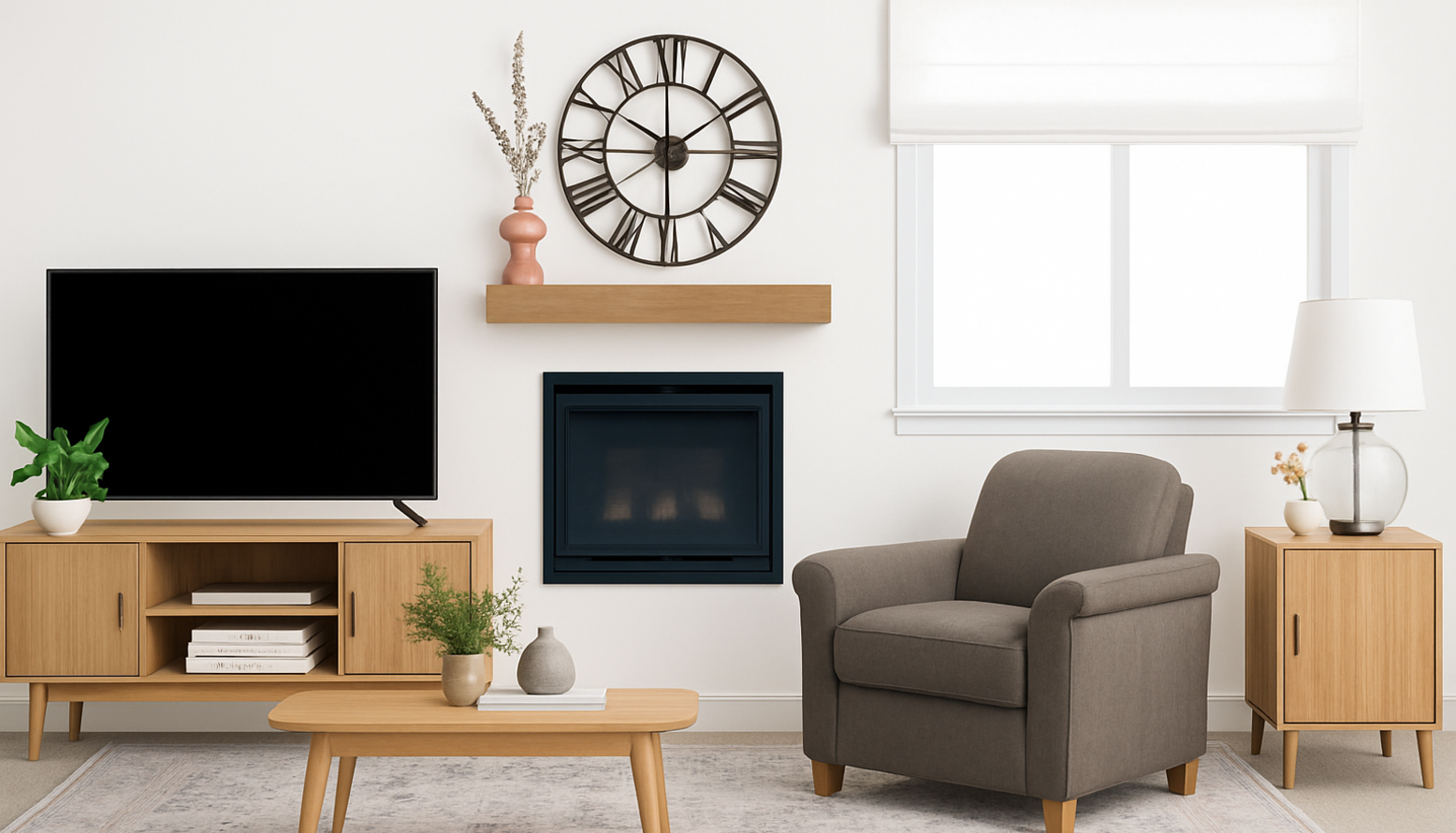 Artistic elements include a serene landscape painting framed in warm tones, positioned above the sofa, contributing to the serene ambiance. The room is softened further by a pale rug that grounds the furniture arrangement. A clear glass table lamp and a sleek black metal wall clock introduce modern accents, while a cozy log basket adds functional charm. Overall, the space strikes a balance between casual comfort and sophisticated style, perfect for relaxation or entertaining.