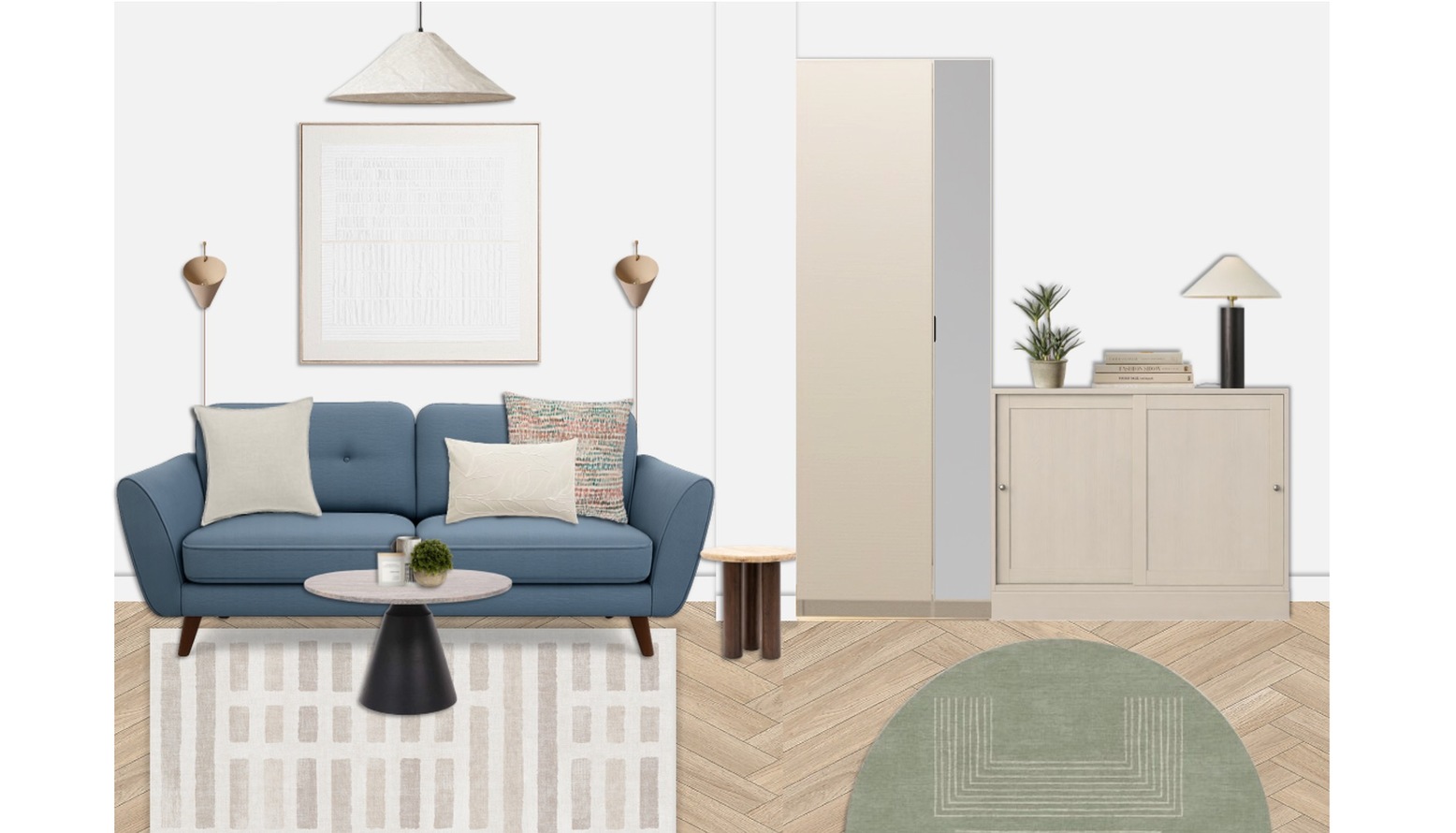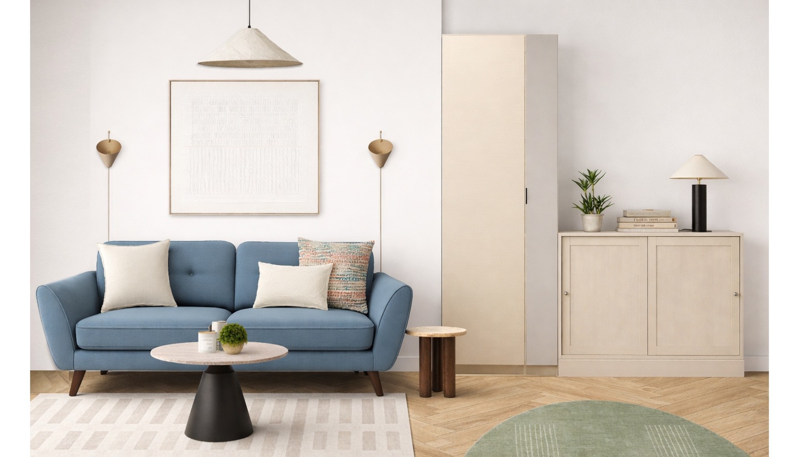 This living room exudes a blend of modern elegance and cozy comfort. A plush blue sofa rests against a neutral wall, adorned with decorative pillows in soft hues. A circular coffee table, featuring a light wooden top and a sleek black base, is positioned centrally, inviting relaxation.