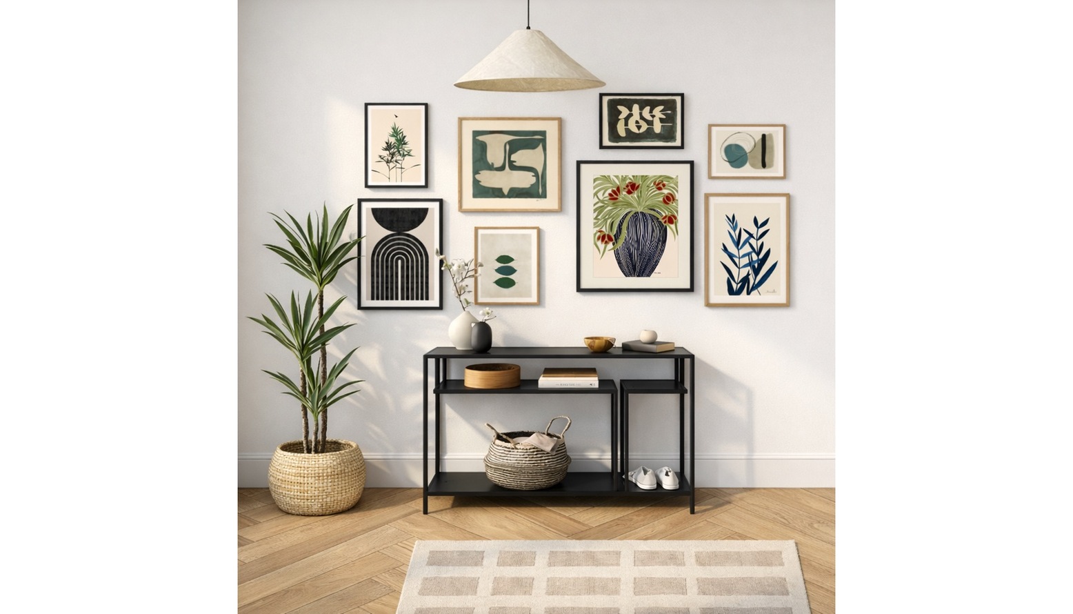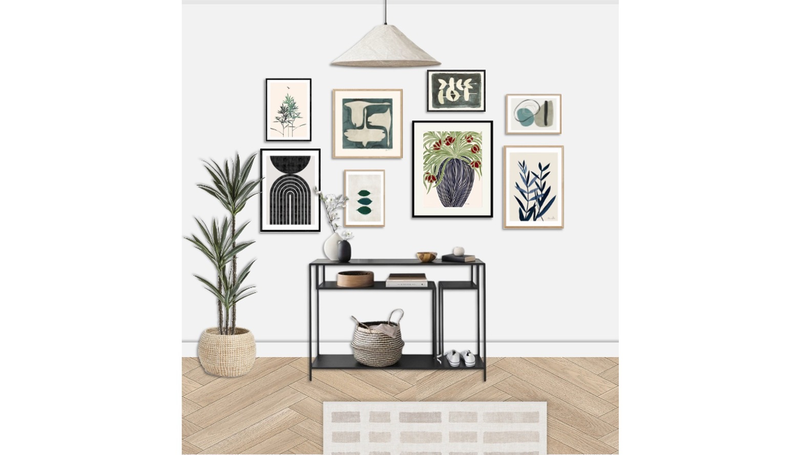 Decorative elements include a framed artwork with abstract patterns, adding a splash of personality to the walls. Green indoor plants in natural planters bring a touch of nature indoors, enhancing the overall tranquility of the space. The room's harmonious palette, featuring muted greens and soft neutrals, creates an inviting atmosphere perfect for both lounging and entertaining.