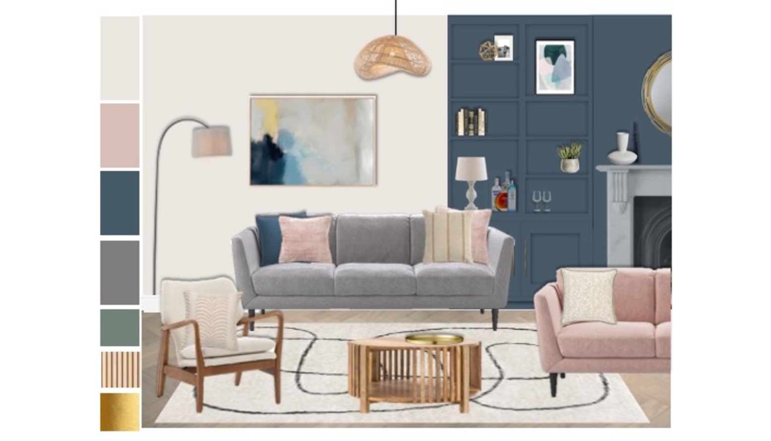 On the walls, a Charlton Gold Mirror at 80cm x 80cm reflects light and enhances the sense of space, while a piece of Stay Grounded Abstract Art Print adds a pop of personality with its black mount. The backdrop features a beautifully designed blue panel, housing decorative accents and books, giving a modern twist to the overall decor.
