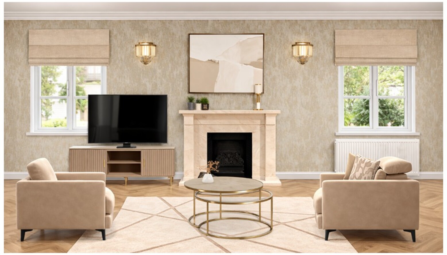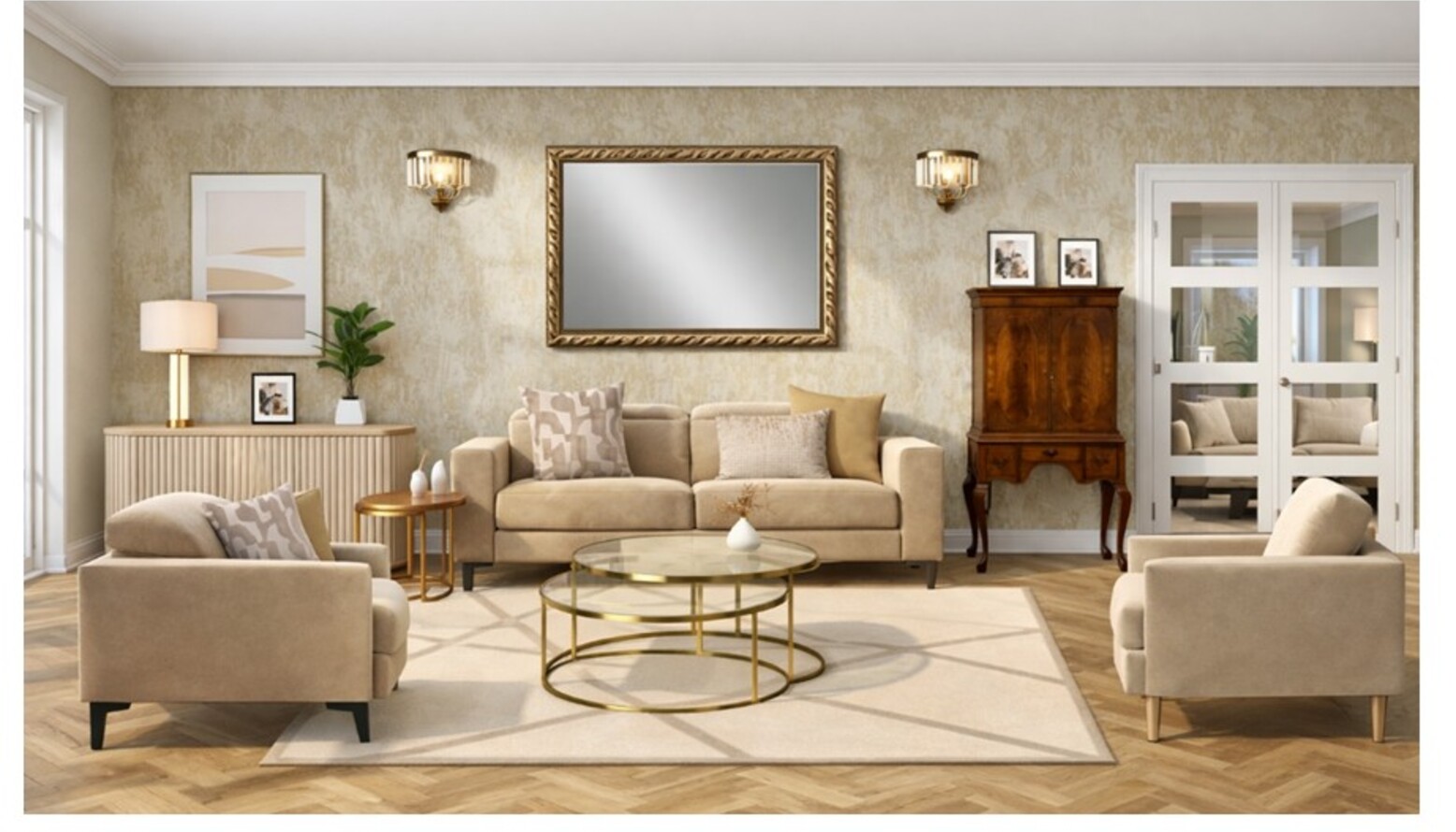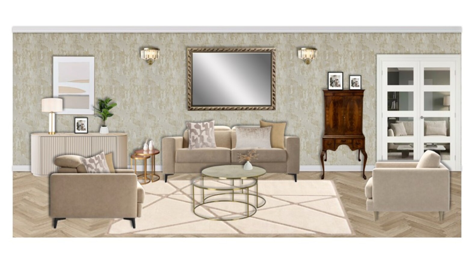 This living room features a harmonious blend of soft neutrals and rich textures, creating a warm and inviting atmosphere. The focal point is a comfortable 2-seat recliner sofa upholstered in fawn Aquaclean Clever Velvet, complemented by a chic assortment of cushions in varying patterns and colors. A stylish Marco armchair in clay house basket weave invites relaxation while a unique Austin sideboard with a fluted cream frame adds elegance and functionality with its push-to-open doors and adjustable shelving. Centering the space is a striking Ringo coffee table, surrounded by a nest of two tables in gold, adding a touch of glamour. The rug, in cream and beige hues, anchors the design, while the walls are elegantly adorned with understated wallpaper, enhancing the contemporary aesthetic. Stylish lighting is provided by an antique brass and crystal wall light mounted on either side of a large framed mirror, which reflects the natural light from windows. A luxurious Kaelin floor lamp adds a finishing touch, perfectly illuminating the area for cozy evenings. Incorporated within the decor are elegant decorative elements like a Liang & Eimil pillar candle holder and thoughtfully curated art pieces, including a 3D canvas that adds depth and interest. Lush greenery is introduced with both real and faux plants, housed in tasteful ceramic planters that elevate the organic feel of the space. With stunning details and a sophisticated color palette, this living room seamlessly combines comfort and style for an inviting retreat.