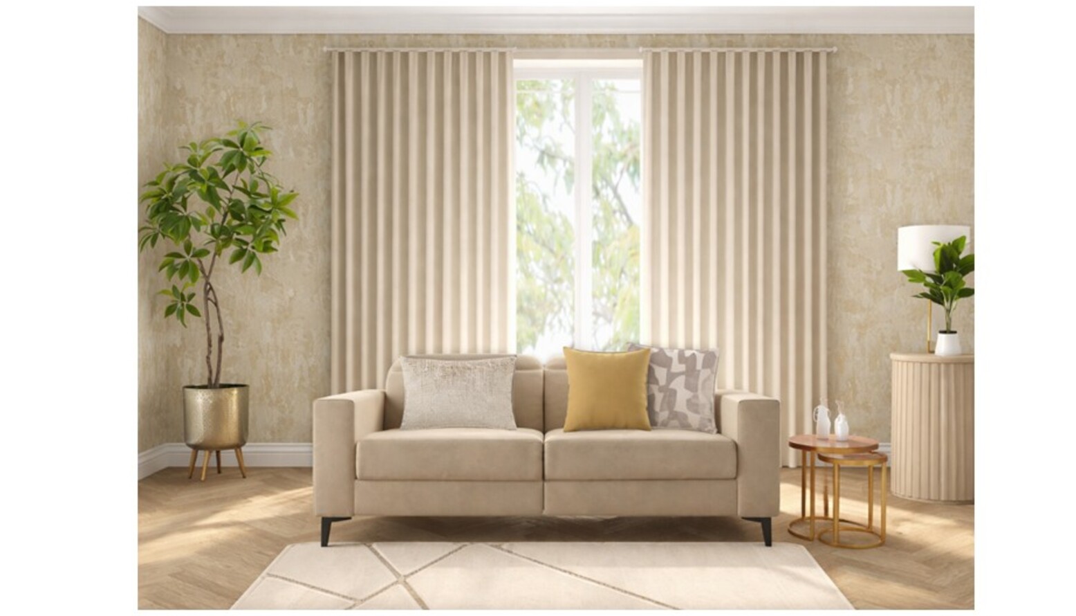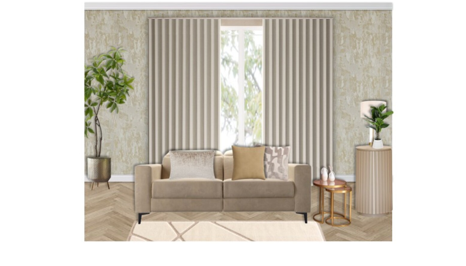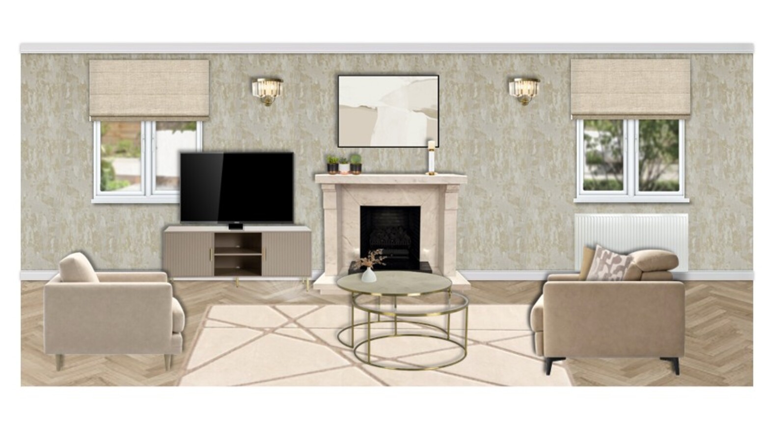 This living room features a harmonious blend of soft neutrals and rich textures, creating a warm and inviting atmosphere. The focal point is a comfortable 2-seat recliner sofa upholstered in fawn Aquaclean Clever Velvet, complemented by a chic assortment of cushions in varying patterns and colors. A stylish Marco armchair in clay house basket weave invites relaxation while a unique Austin sideboard with a fluted cream frame adds elegance and functionality with its push-to-open doors and adjustable shelving. Centering the space is a striking Ringo coffee table, surrounded by a nest of two tables in gold, adding a touch of glamour. The rug, in cream and beige hues, anchors the design, while the walls are elegantly adorned with understated wallpaper, enhancing the contemporary aesthetic. Stylish lighting is provided by an antique brass and crystal wall light mounted on either side of a large framed mirror, which reflects the natural light from windows. A luxurious Kaelin floor lamp adds a finishing touch, perfectly illuminating the area for cozy evenings. Incorporated within the decor are elegant decorative elements like a Liang & Eimil pillar candle holder and thoughtfully curated art pieces, including a 3D canvas that adds depth and interest. Lush greenery is introduced with both real and faux plants, housed in tasteful ceramic planters that elevate the organic feel of the space. With stunning details and a sophisticated color palette, this living room seamlessly combines comfort and style for an inviting retreat.