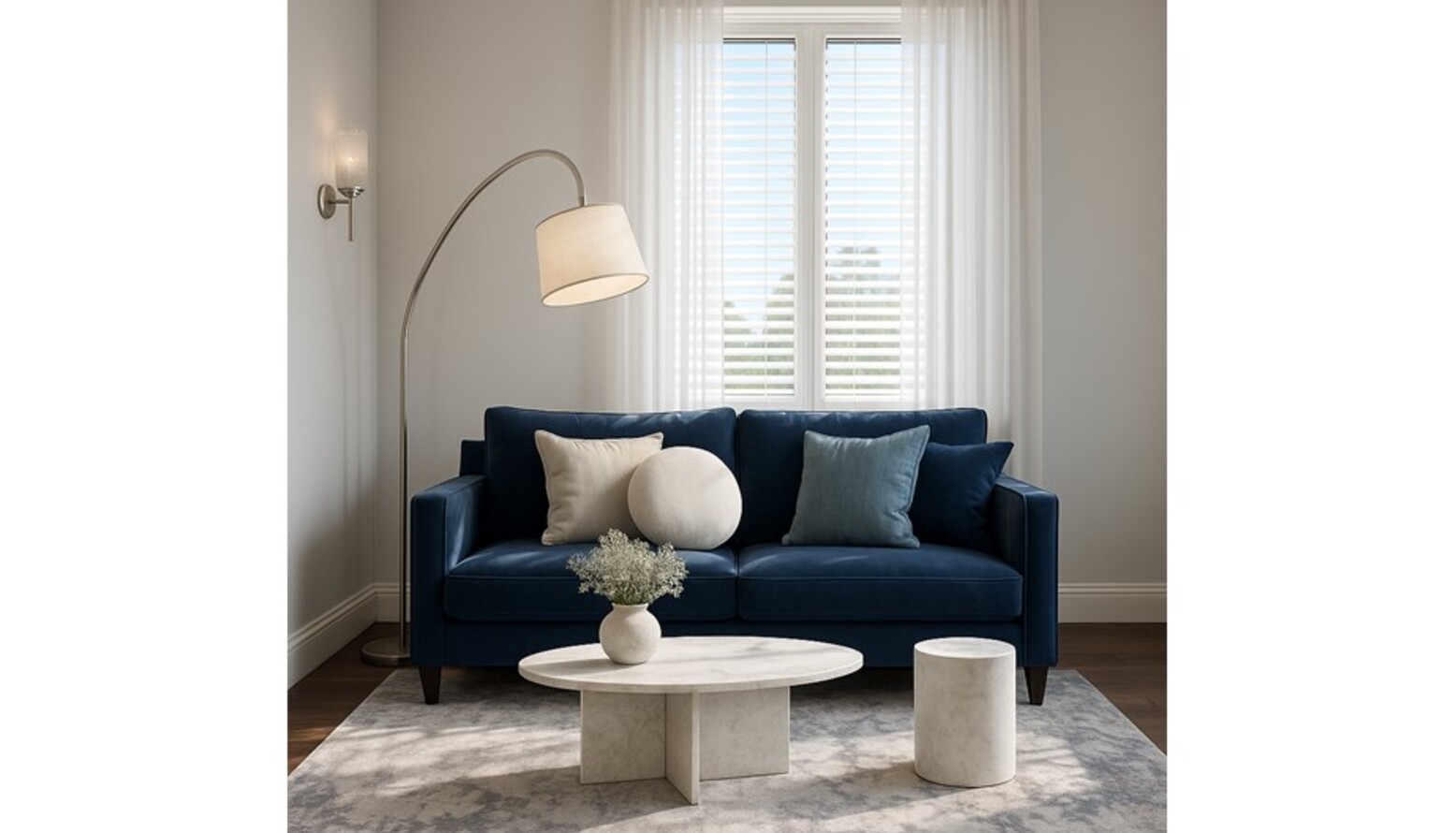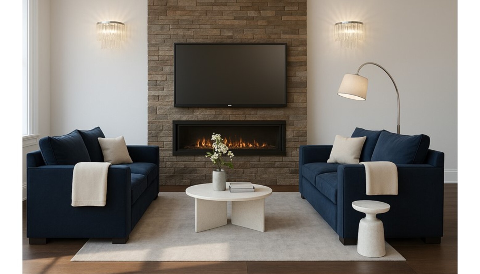 Flanking the seating area, two tiered glass wall lights provide a soft, ambient glow, while a modern arc floor lamp enhances the functionality and style of the space. The choice of plush, textured rugs beneath the sofa grounds the area, adding softness and depth.