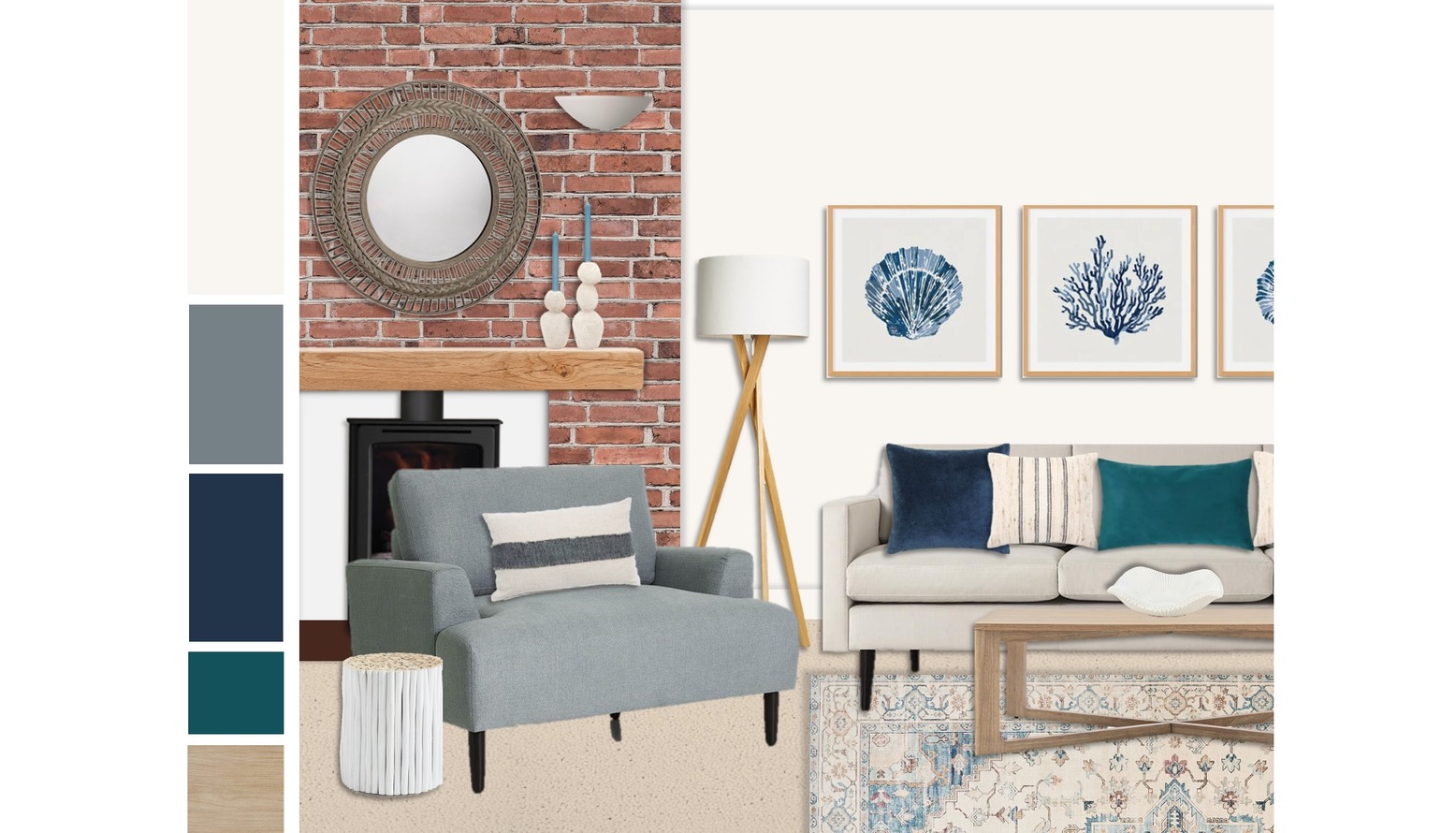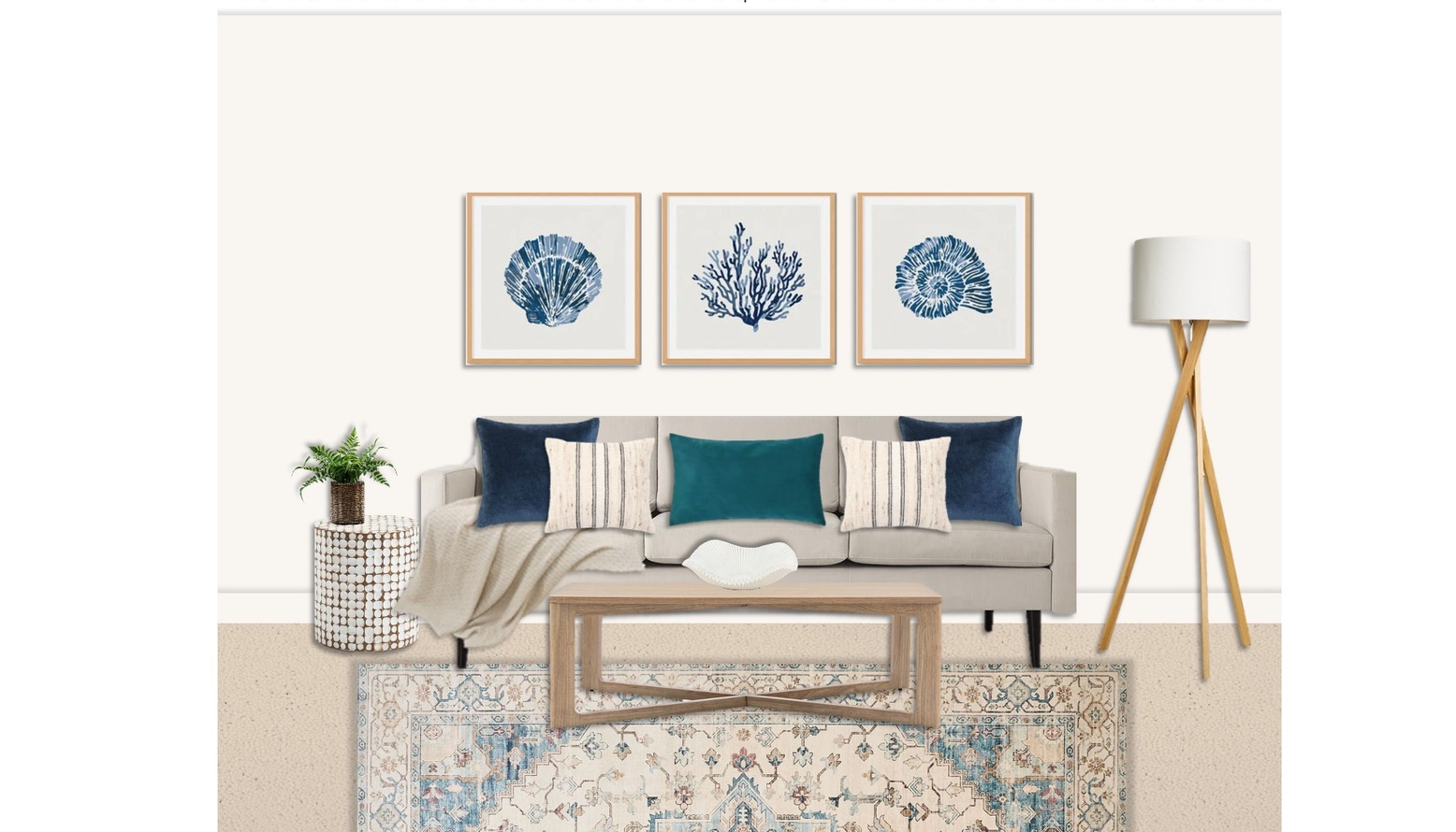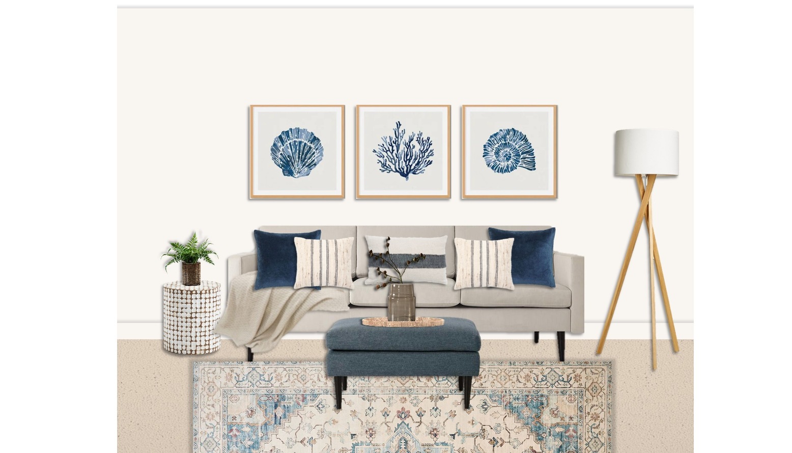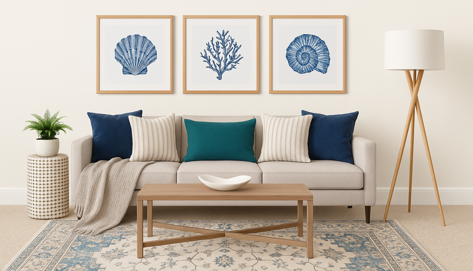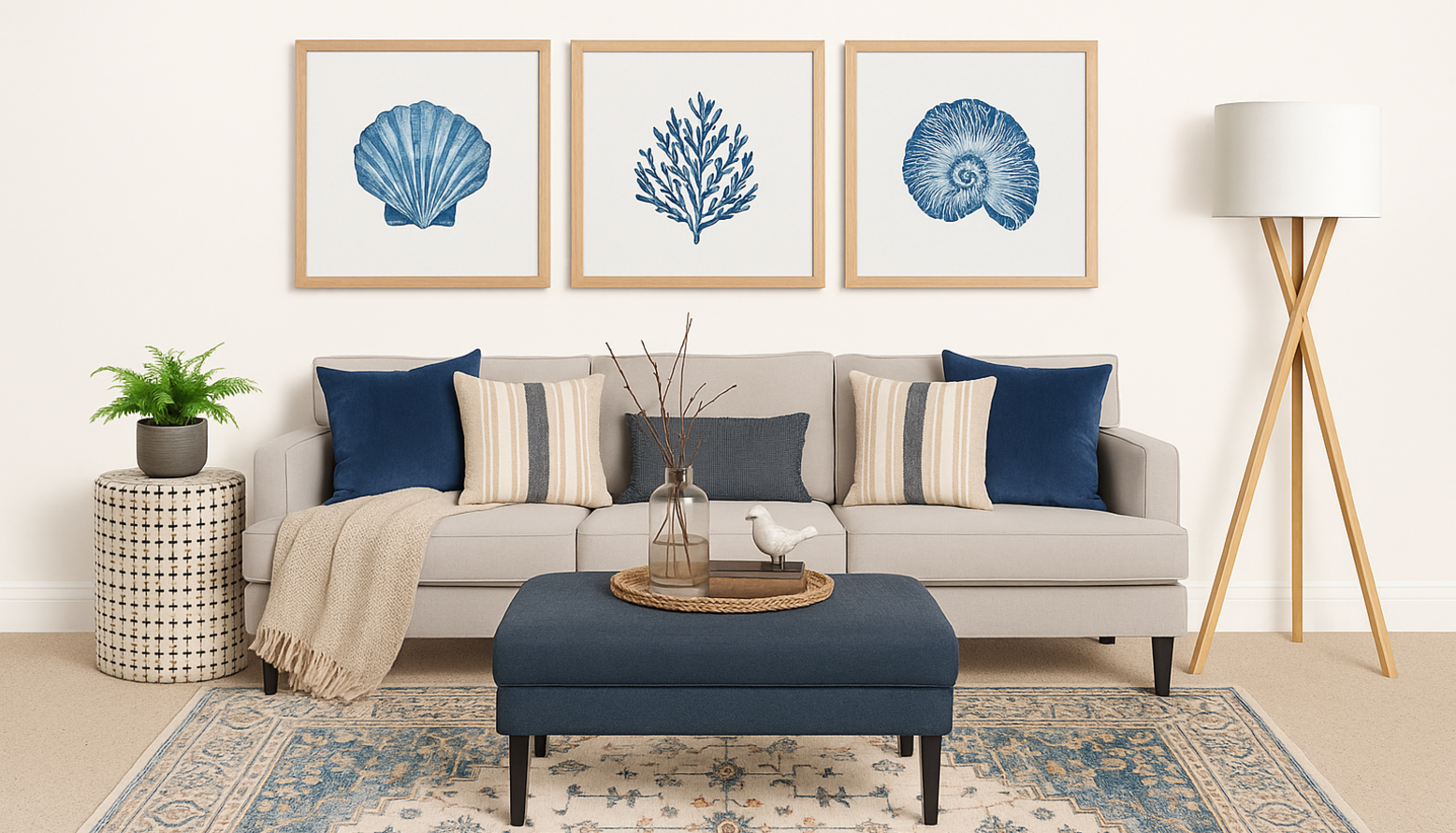 The living room presents a serene coastal theme, ideal for an AirBnB setting. Central to the space is a soft bone-colored three-seater sofa, layered with a mix of decorative cushions in night sky blue and soft beige, offering both comfort and style.