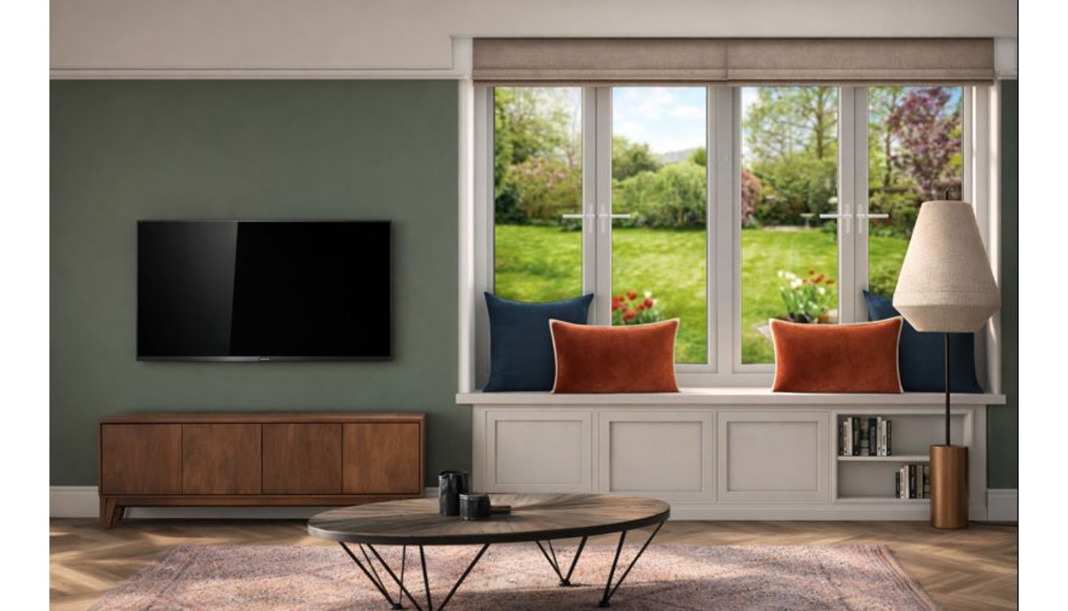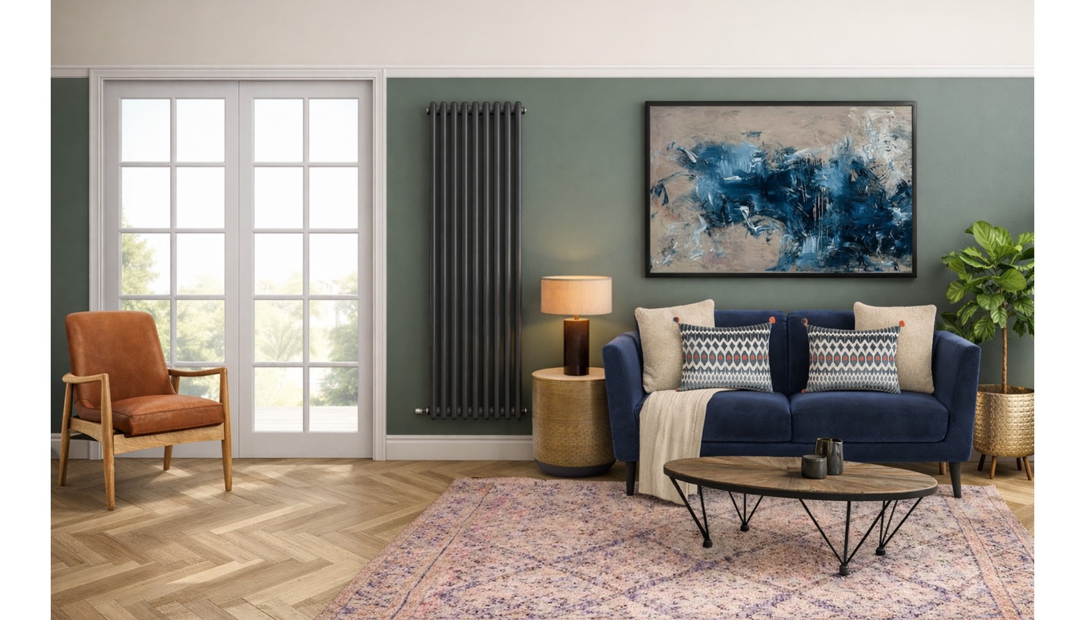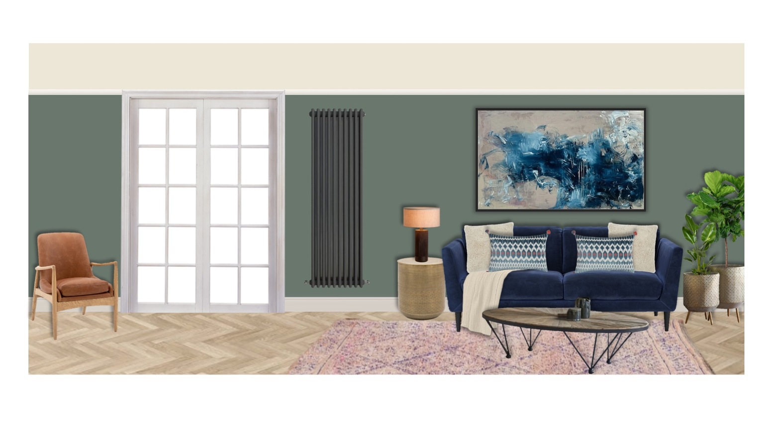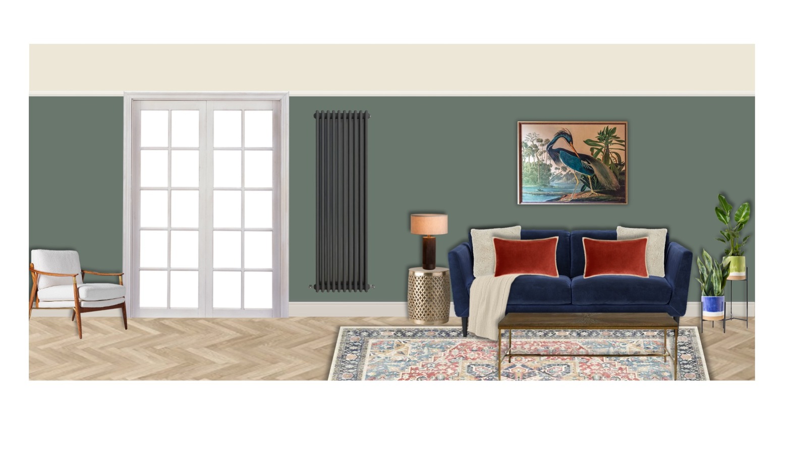 A sleek radiator is situated against one wall, elegant yet functional, while large French doors allow natural light to flood the space, connecting the indoor with the outdoor environment. This living room is a perfect retreat, balancing elements of nature with refined furnishings, creating a space that feels both welcoming and sophisticated.
