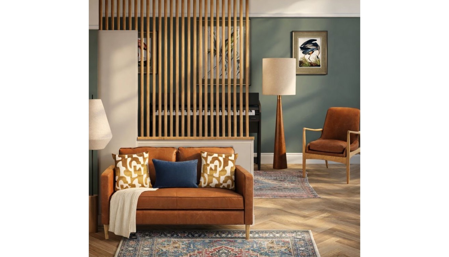 The living room showcases a harmonious blend of comfort and style. A rich navy sofa takes center stage, adorned with patterned cushions that add a touch of visual interest. Opposite, a vintage brown leather armchair complements the sofa, inviting relaxation in a warm hue. A unique coffee table of organic shapes rests at the center, enhancing the space's cozy feel.